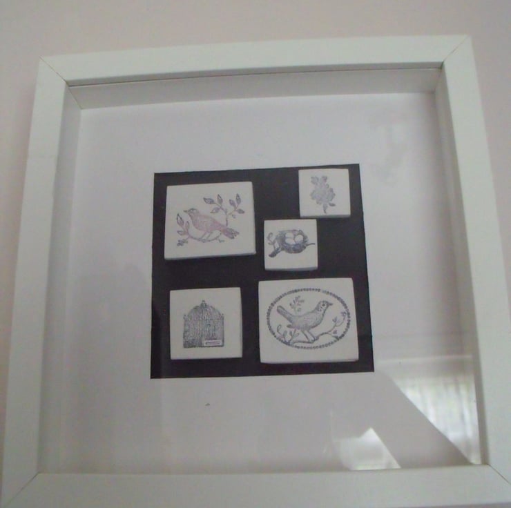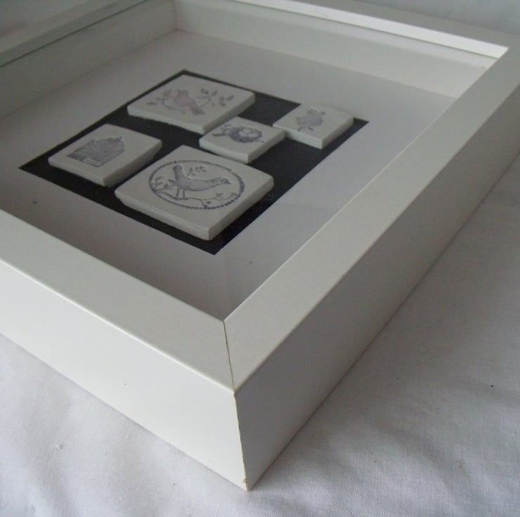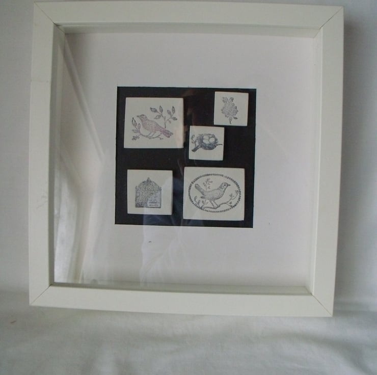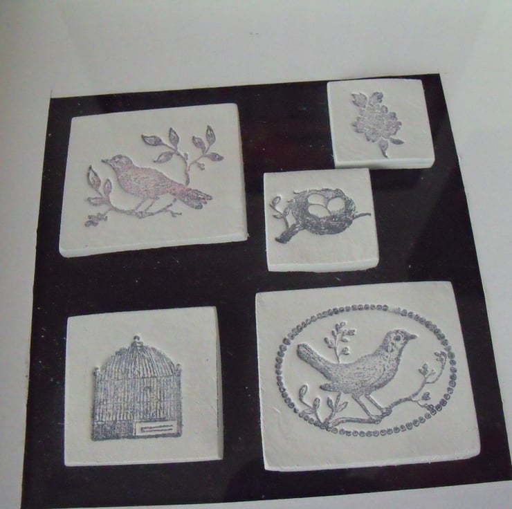 For this piece I used air dried clay which I made into tiles, impressed them with bird related images in black ink then attached them to the back panel which I sprayed black to make the tiles stand out.