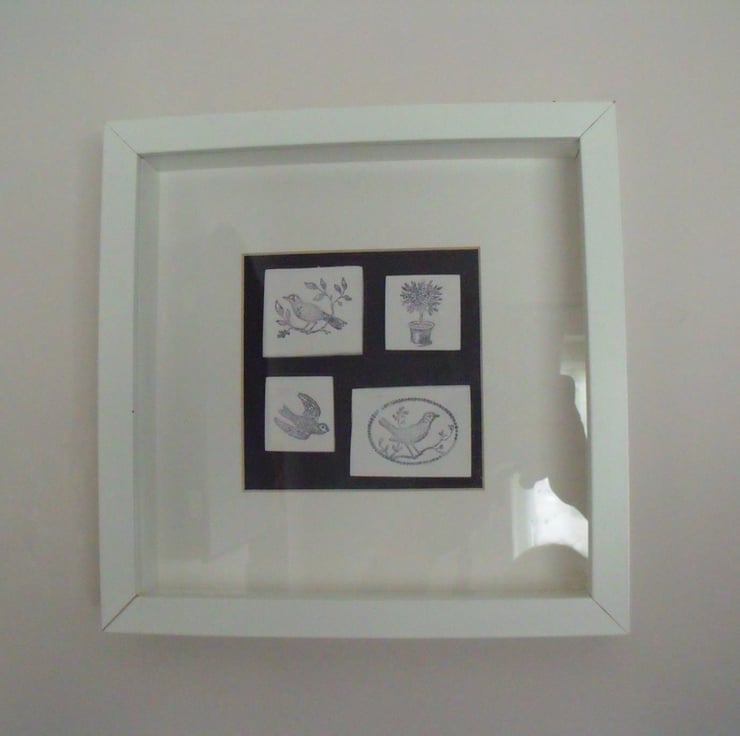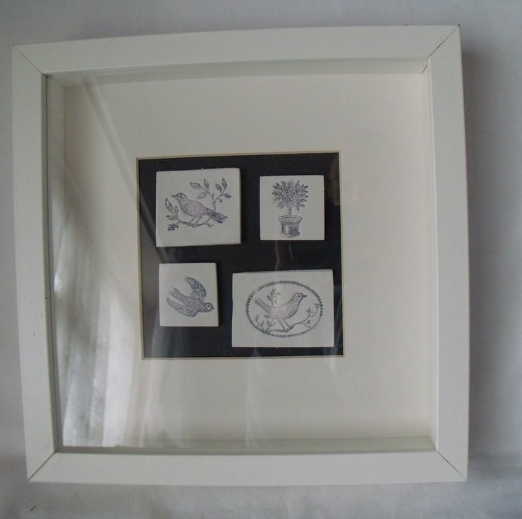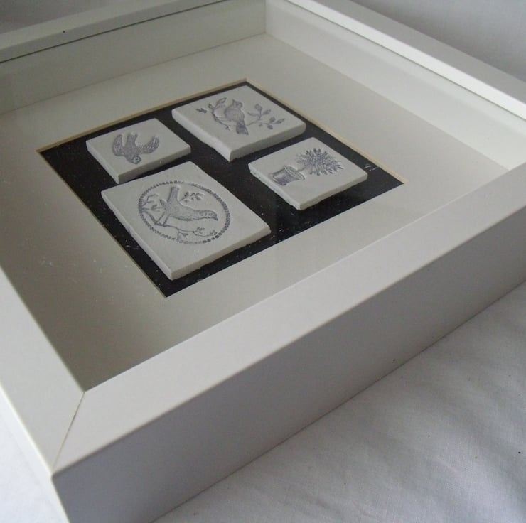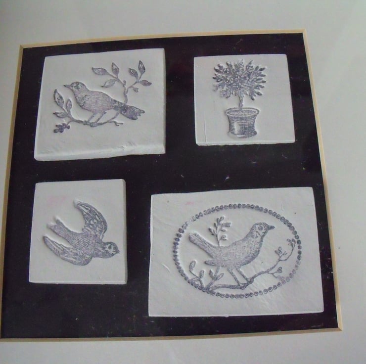 For this piece I used air dried clay which I made into tiles, impressed them with bird related images in black ink then attached them to the back panel which I sprayed black to make the tiles stand out.