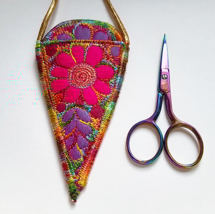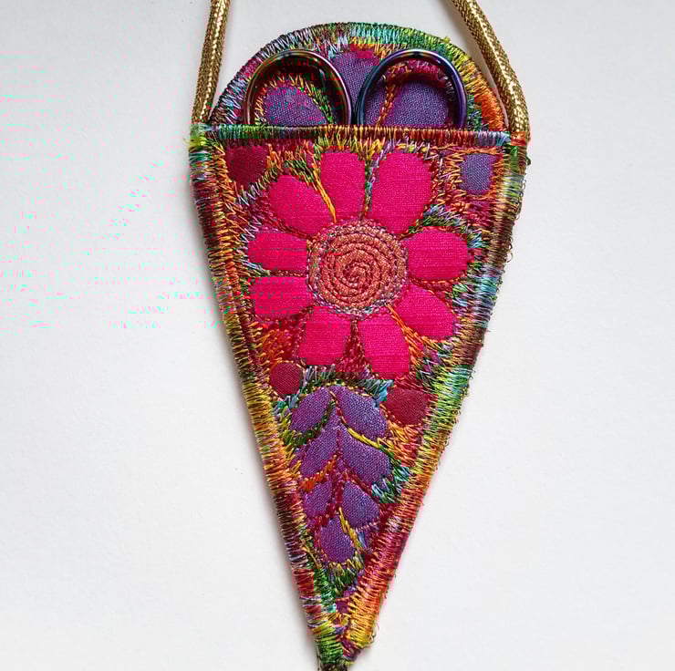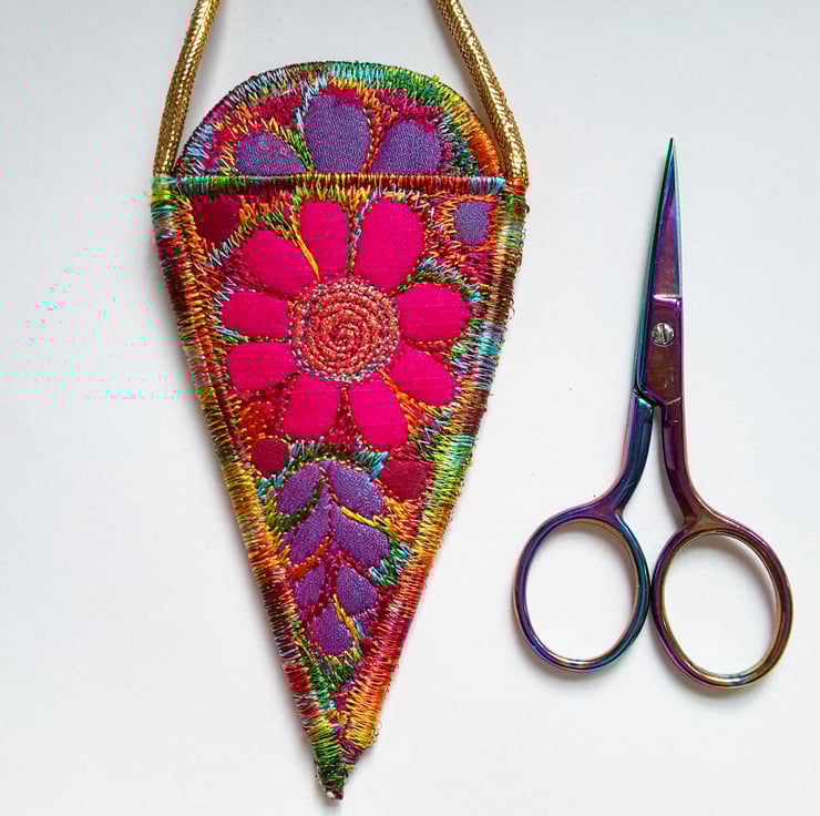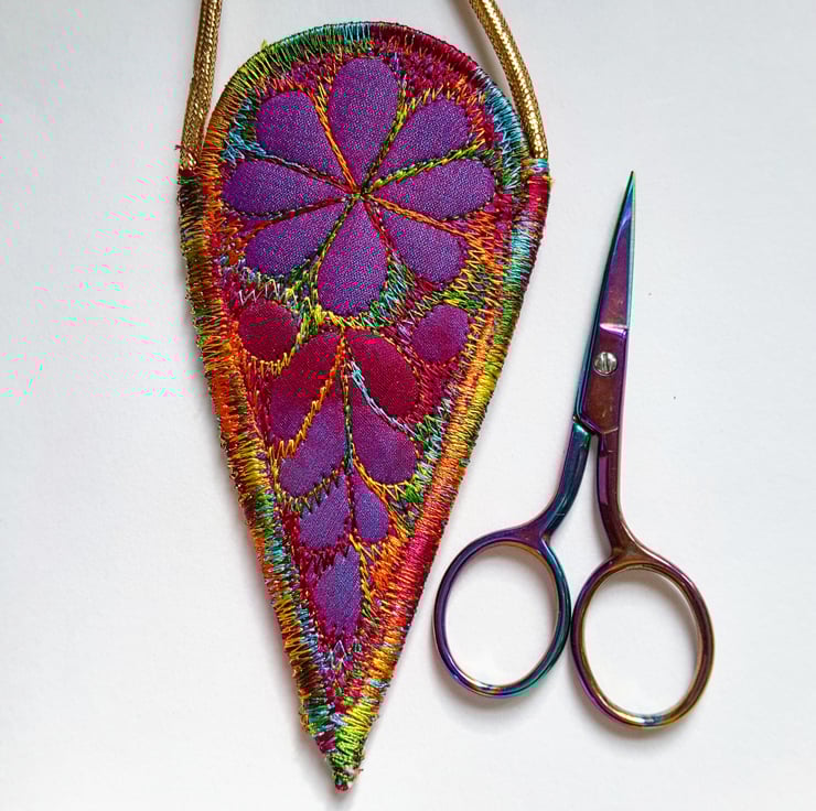 This is a handmade machine stitched fabric sewing scissors necklace holder case