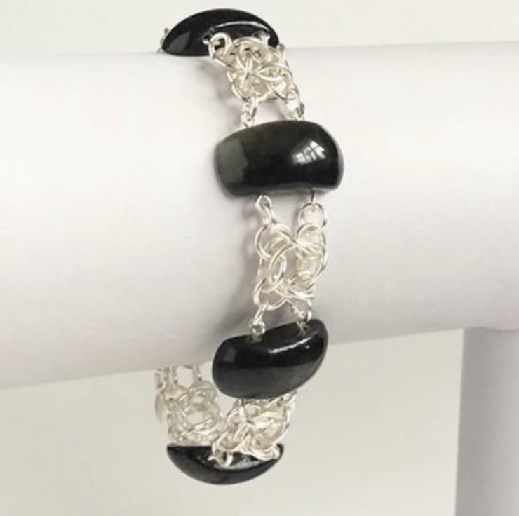 Sterling Silver Black Golden Obsidian Chainmaille Bracelet.