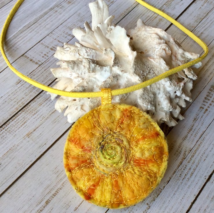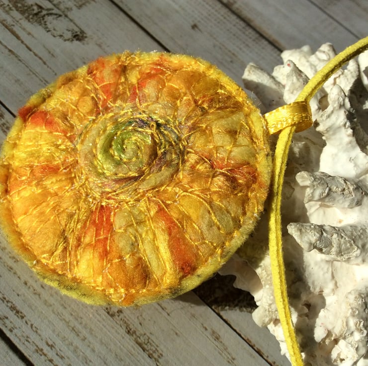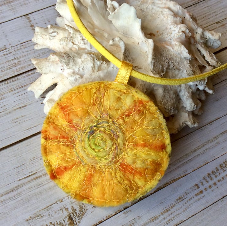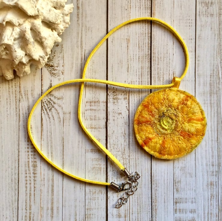 This joyously warm handmade sun embroidered necklace is created with layers of needle felting, Angelina fibres and free motion embroidery. Comes with matching a faux suede cord. The length of the chain is adjustable and is fitted with a lobster clasp. The pendant is felt backed and it measures 5.5 x 5.5cm approx. The necklace cord length is approx. 45 cm/ 18 inches, with 5 cm/ 2 inches extension chain, each cord width is 2.7 mm, and the thickness is 1.6 mm.