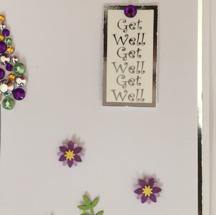 Perfect for every special person in your life to say get well soon. The design is a 3D silver watering can with 3D flowers and foliage, sitting next to trees made from gemstones in matching colours, and a cute pink 3D butterfly. The 3D greeting is silver foiled.