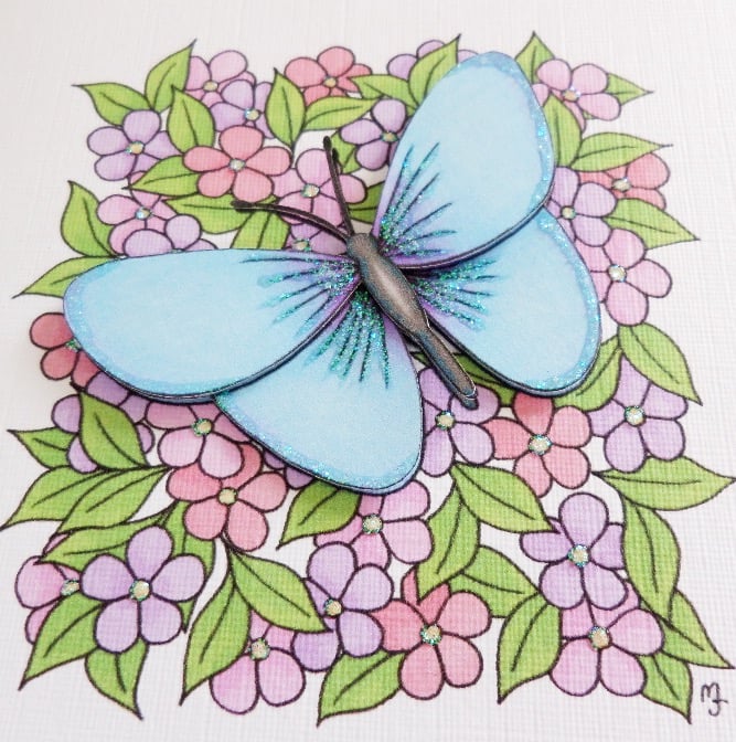 This pretty Little Flowers & Blue Butterfly card has been designed using my own original illustration. The image has been printed out onto good quality white linen embossed card and decoupaged up in parts. I have also added a little glitter detail to the centre of the little flowers and the butterfly wings.