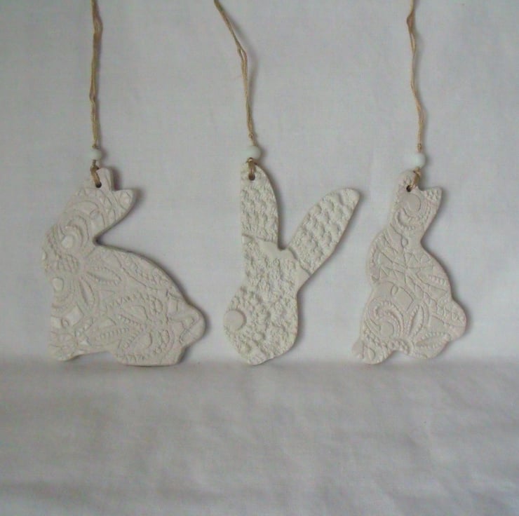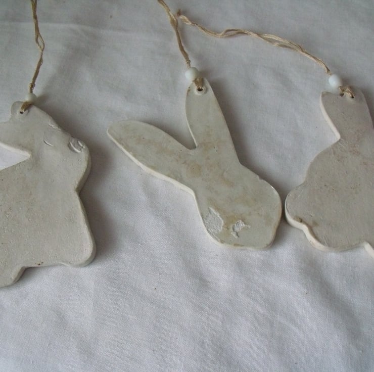 Here I've made a set of three decorative ceramic hanging rabbits.