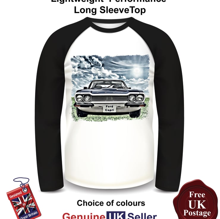 Capri MK1, Capri Mens T Shirt, Capri MK1 Long Sleeve Top, Men's Baseball Top Long Sleeves Choose Your Colour & Size, This is a fan Inspired unofficial product the art work designed by us Aggies Bags the 160 gsm Featuring a lean design this 65% Polyester 35% Cotton lightweight performance T Shirt printed by us with a cotton-feel Polyester 180gsm (front and back) with 65% Polyester 35% cotton 160gsm (arms and neck) means it is a good quality garment for any occasion T Shirt ideal for the summer or holiday t shirt with an even and smooth surface Comfortable body length construction for a perfect look Side seams ensure the best fit For long-lasting comfort the neck seams are reinforced with soft binding Thin collar in self-fabric for modern up to date appearance Minimalist cut and detailing suitable for many uses and any end user requirements.
