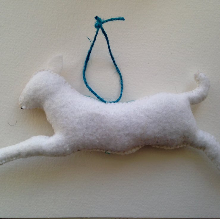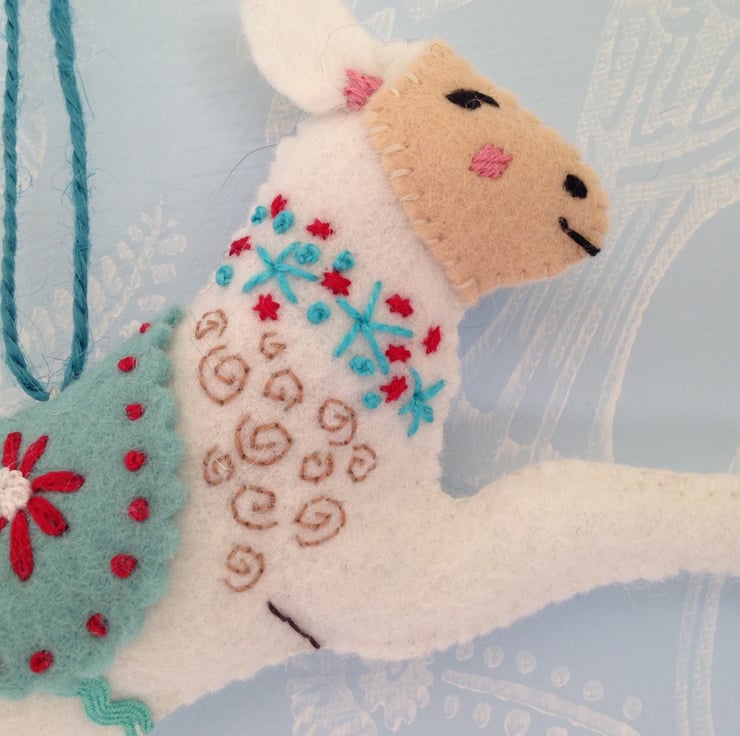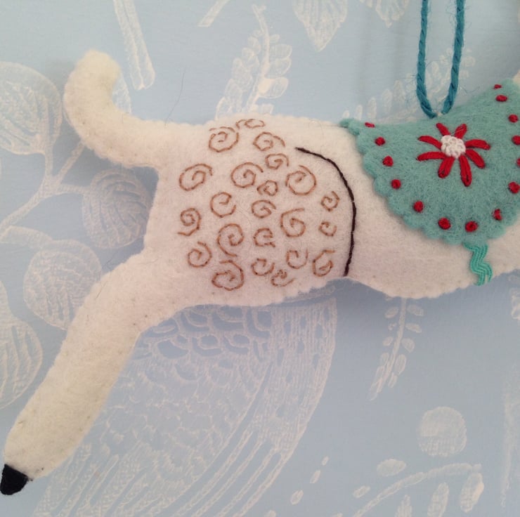 I have designed and hand sewn this white felt lamb. It measures 18cm in length , 11 cm in height and is 3 cm thick . It has a blue coat embroidered with a red flower and French knots. There is a flower wreath around its neck, it has a beige face and an embroidered body. There is a blue string loop to hang it with. and it is filled with toy stuffing. It is plain on the other side.