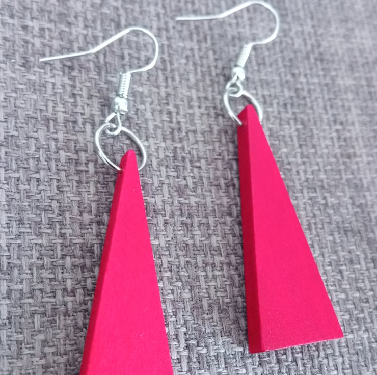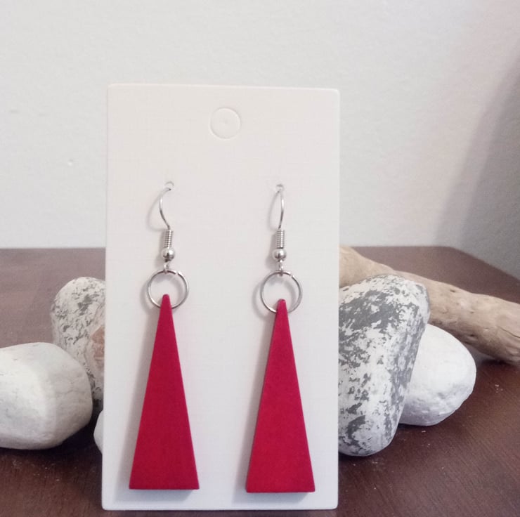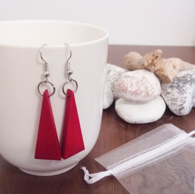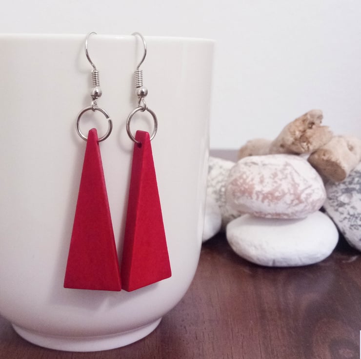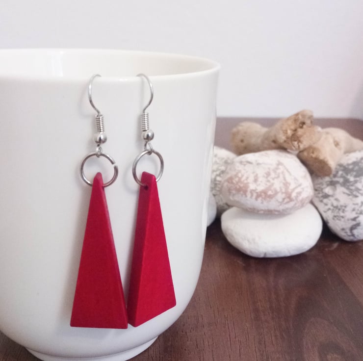 This pair of silver plated dangle earrings feature large red wooden isosceles triangle pendants.