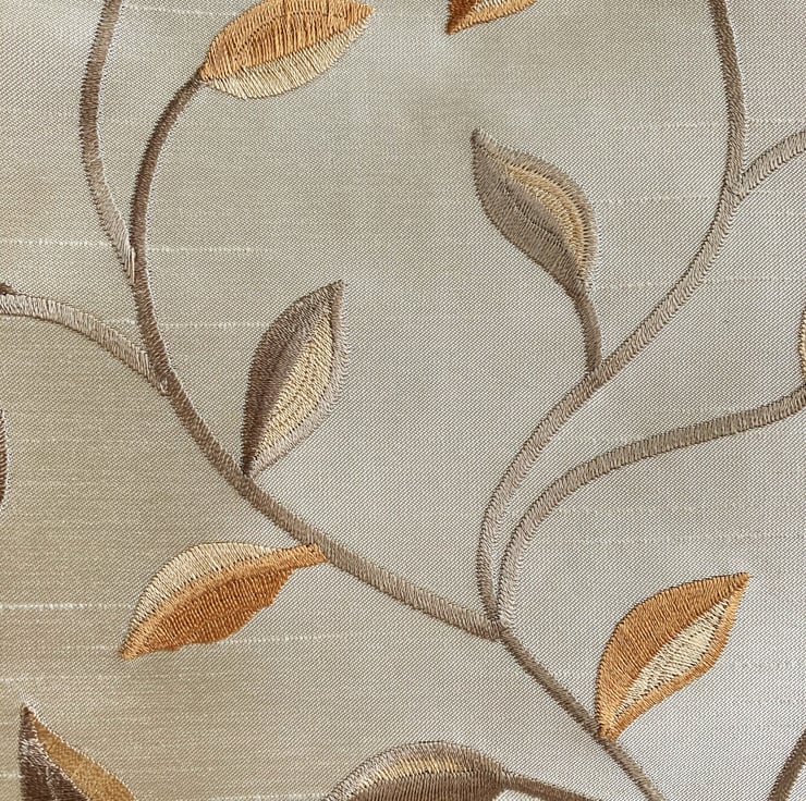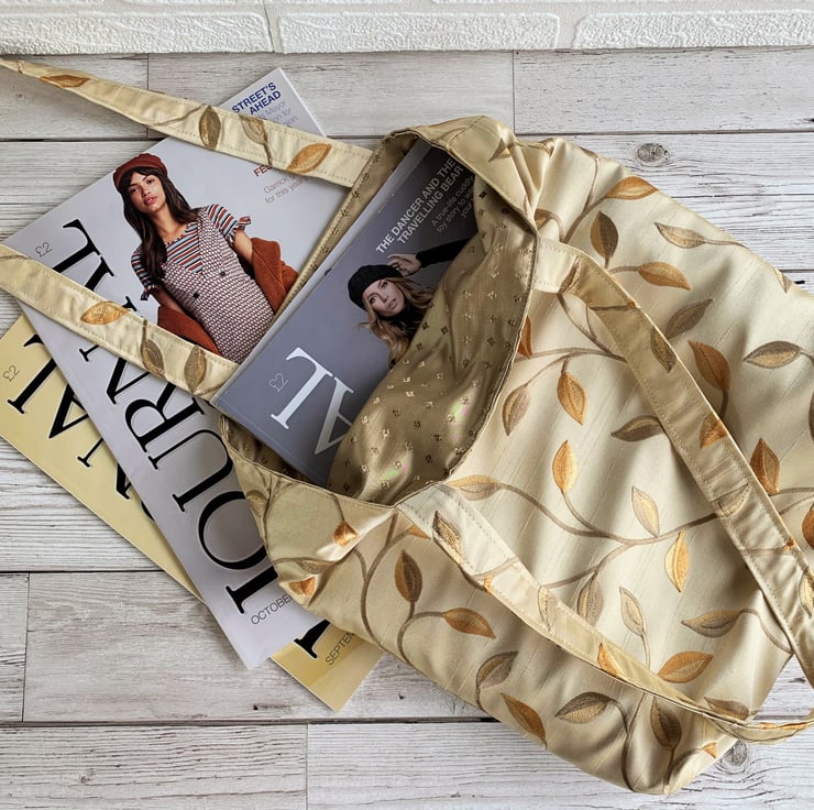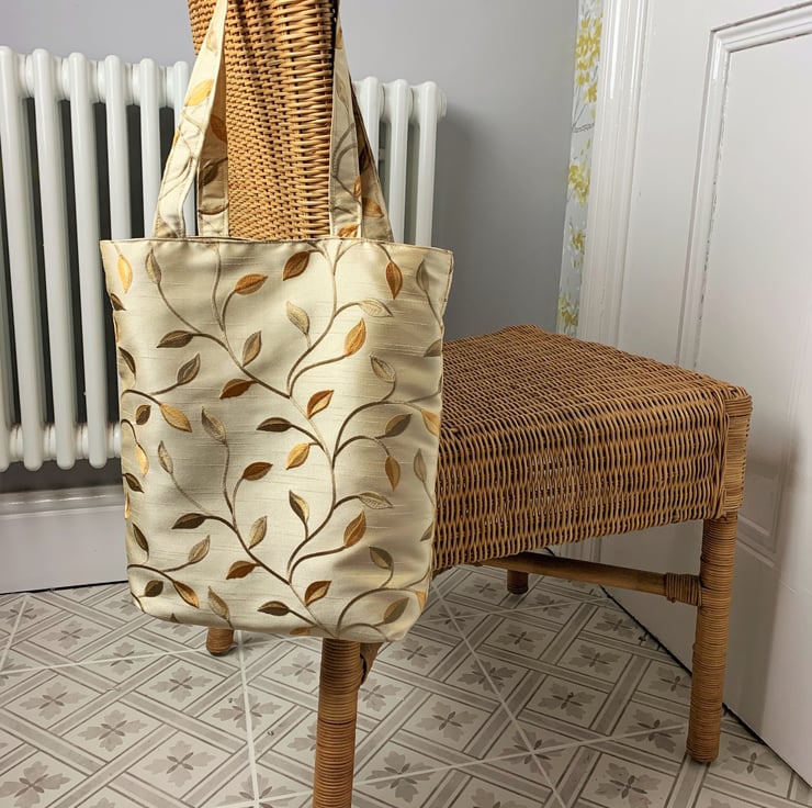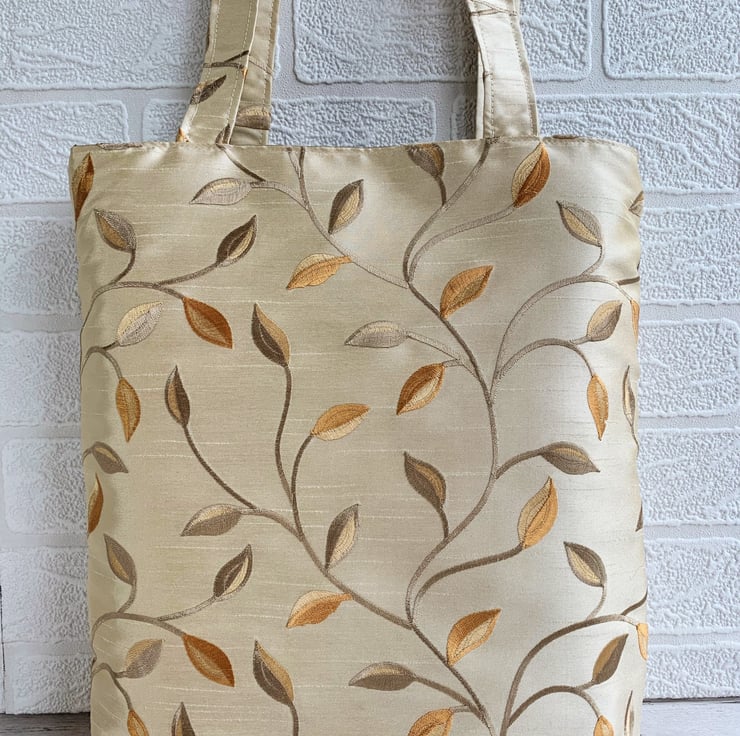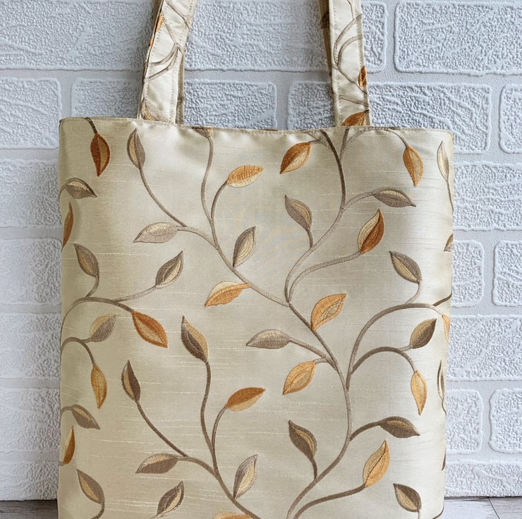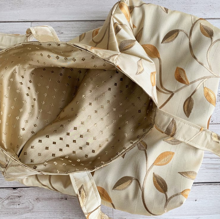 A lovely tote bag in a luxurious embroidered gold-coloured satin-sheen fabric. The embroidered pattern features twining beige branches covered in leaves in warm shades of gold, beige and burnt orange. The bag is lined with a luxurious gold satin fabric with a pattern of small diamonds.