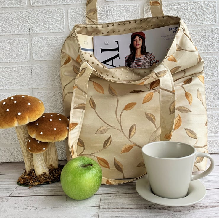 This tote bag is very versatile - perfect for use as a shopping bag but pretty enough to be used as a handbag. It can be easily folded and placed inside a handbag which is convenient for avoiding the use of plastic carrier bags. With its luxurious fabric and pretty leaf pattern, it would be perfect for a special occasion or would make a lovely gift.