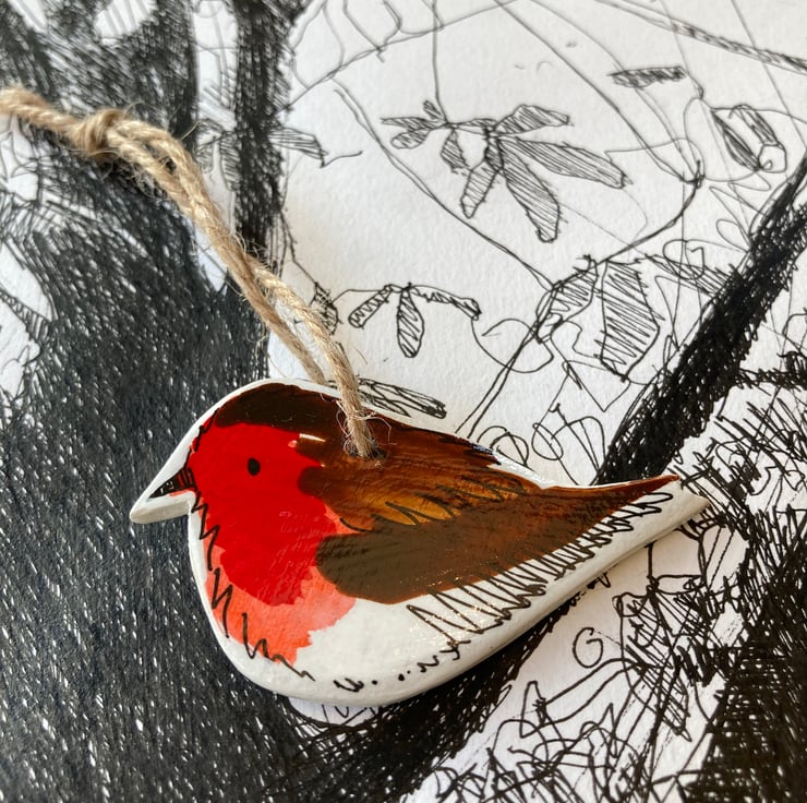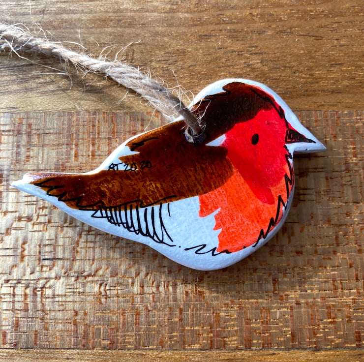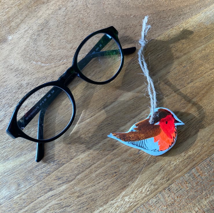 Little wooden hanging Robin decoration. I love every part of the process from cutting out to the final coat of varnish. Although my favourite part is painting with acrylic inks and adding the detail to try and give each little bird it's own character.