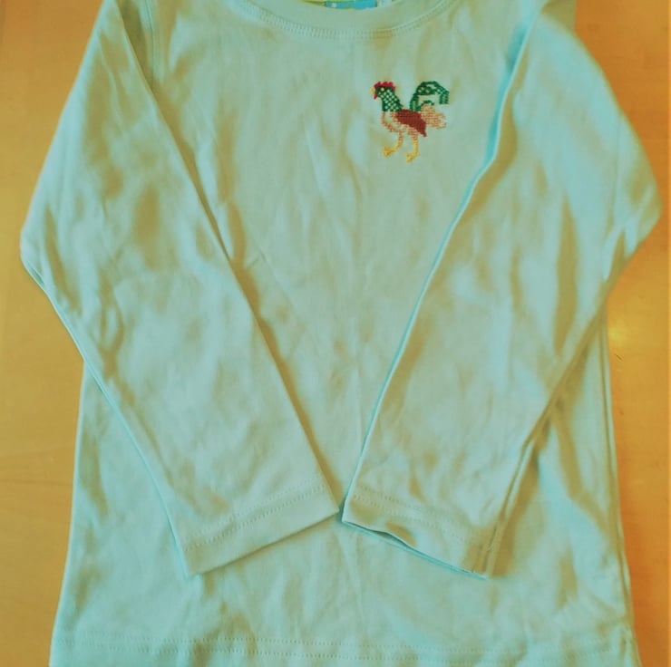 I have hand-stitched a colourful, crowing cock on the front of this good quality, pale green, long-sleeved T-shirt. The shirt has a soft velvet band around the back of the collar. As I never use a permanent backing when embroidering kids' clothing, there is nothing inside this shirt to irritate your child's skin. It is 100% cotton and machine washable. In my opinion the shirt is equally suitable for a boy or a girl, though the manufacturer has labelled it 'Sunshine Boy'
