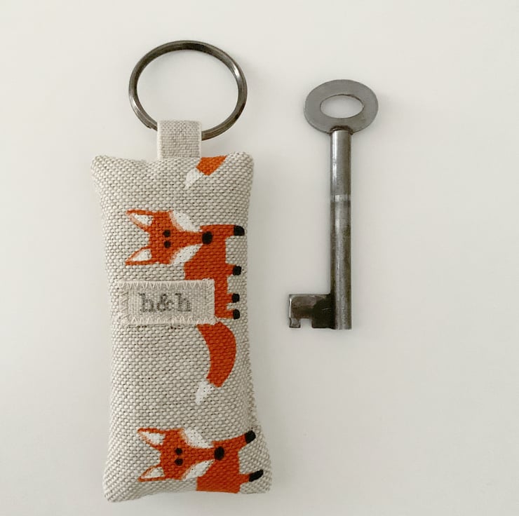 Fragrant and tactile, the key rings feature handsome russet foxes on a taupe linen-look background and are finished with a rustic wooden button on one side and a linen 'h&h' label on the other side. The metal split ring is attached with a linen tape loop.
