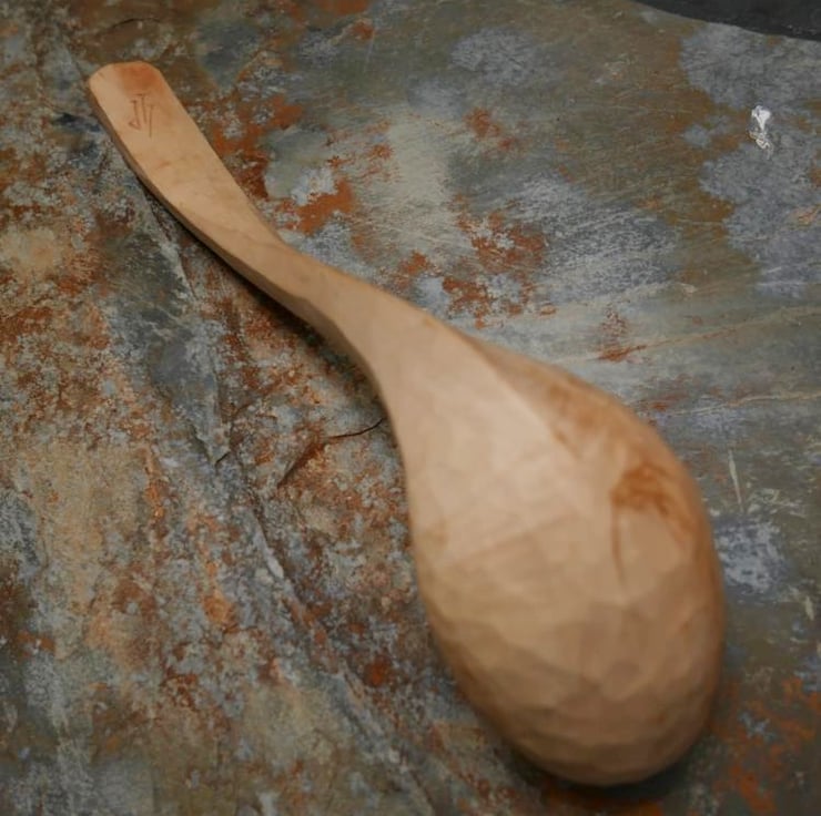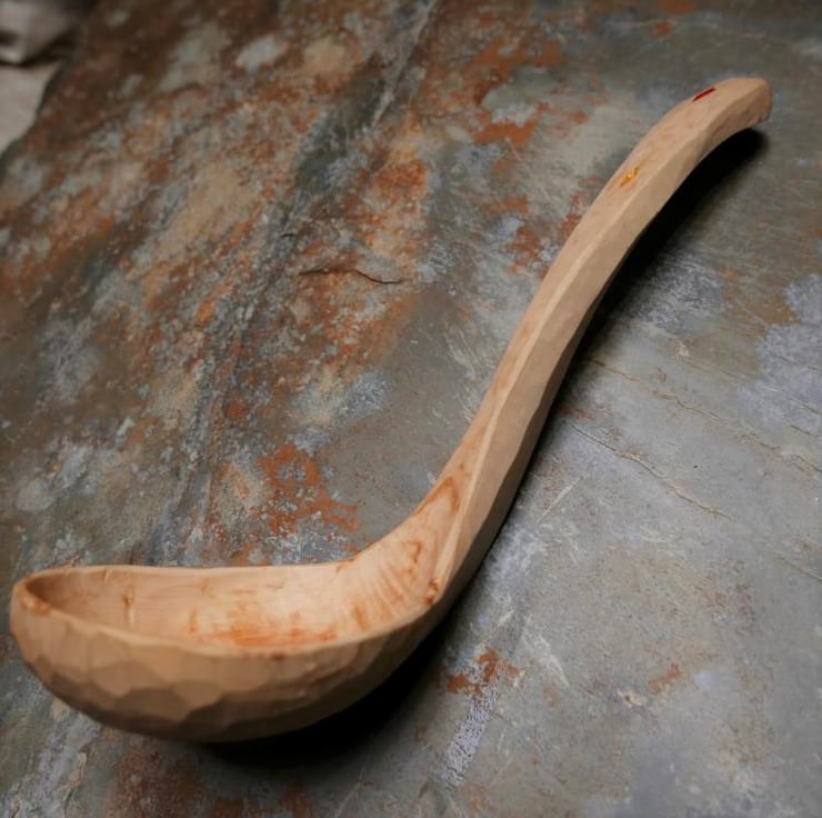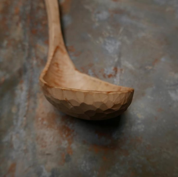 The ladle has been soaked with culinary grade linseed oil and allowed to dry, giving the bare wood a protective finish.