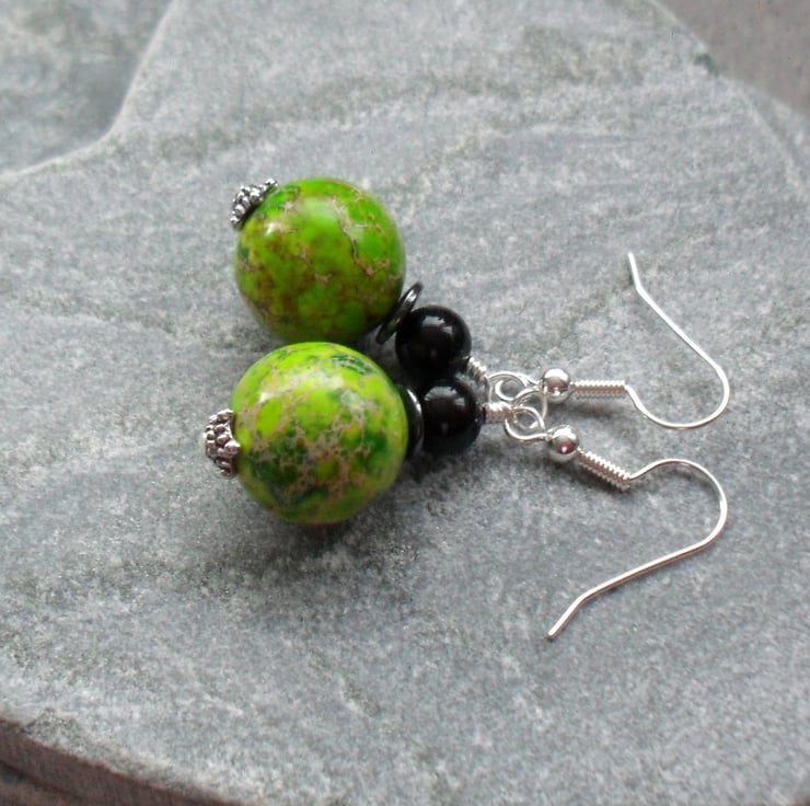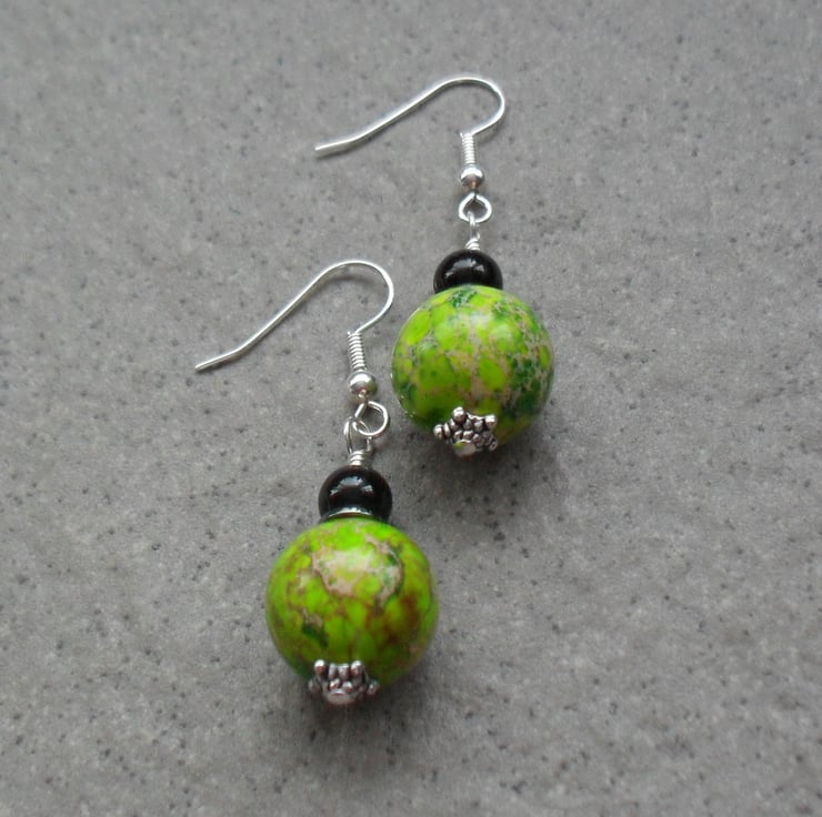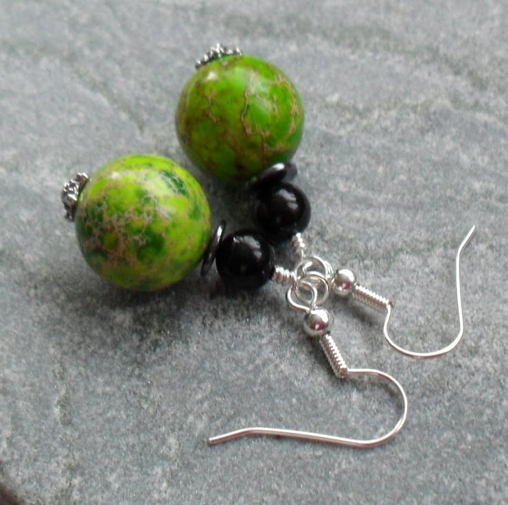 Shades of bright green creams and a little brown dyed terra jasper semi precious gemstones, haematite and black agate with silver tone beads are attached to silver plated ear wires
