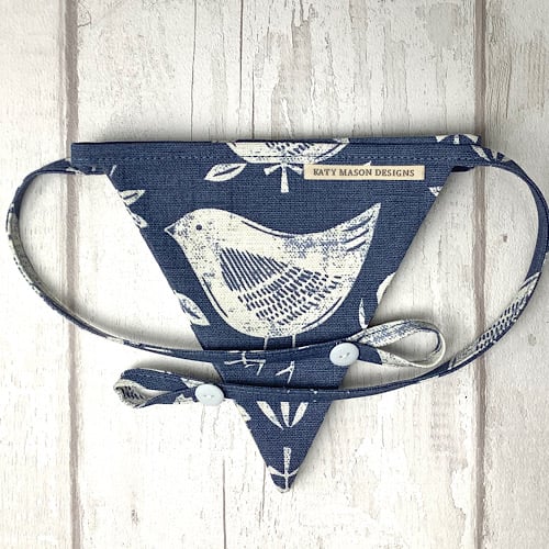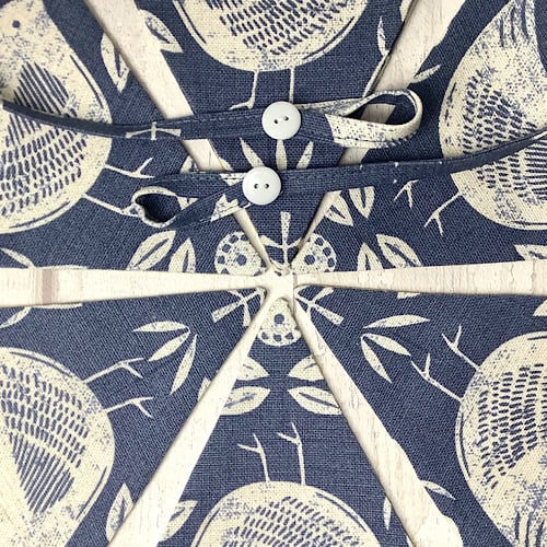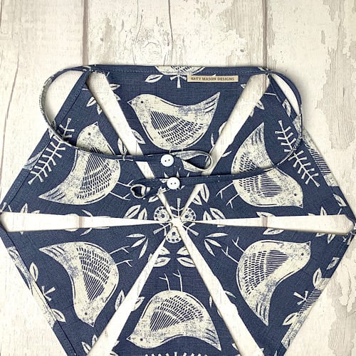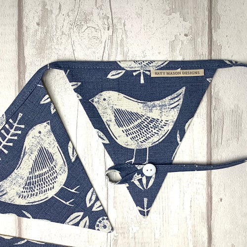 Pretty blue folk art style bunting. 7 flags approximately 165cm long with hanging loops and button detail. Yellow spot cotton on the reverse.