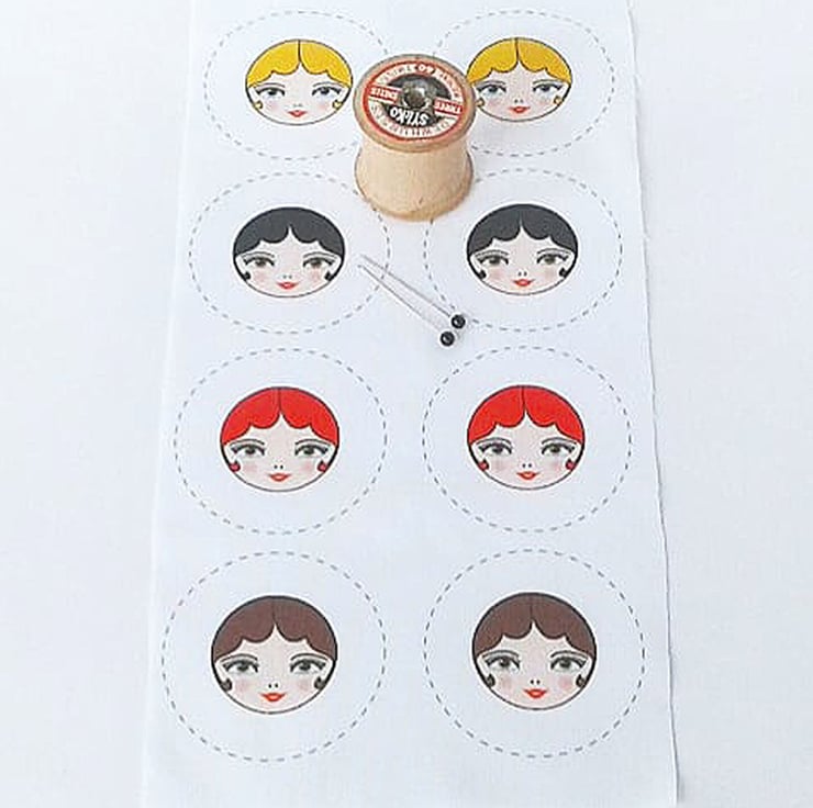 This fabric panel contains 8 tiny doll faces for making your own covered buttons. Most of the work has been done for you, no need for templates, just cut around the outside dotted lines then attach them to your own button blanks.(see last 2 images for examples of projects made using the mini doll faces once made into covered buttons).