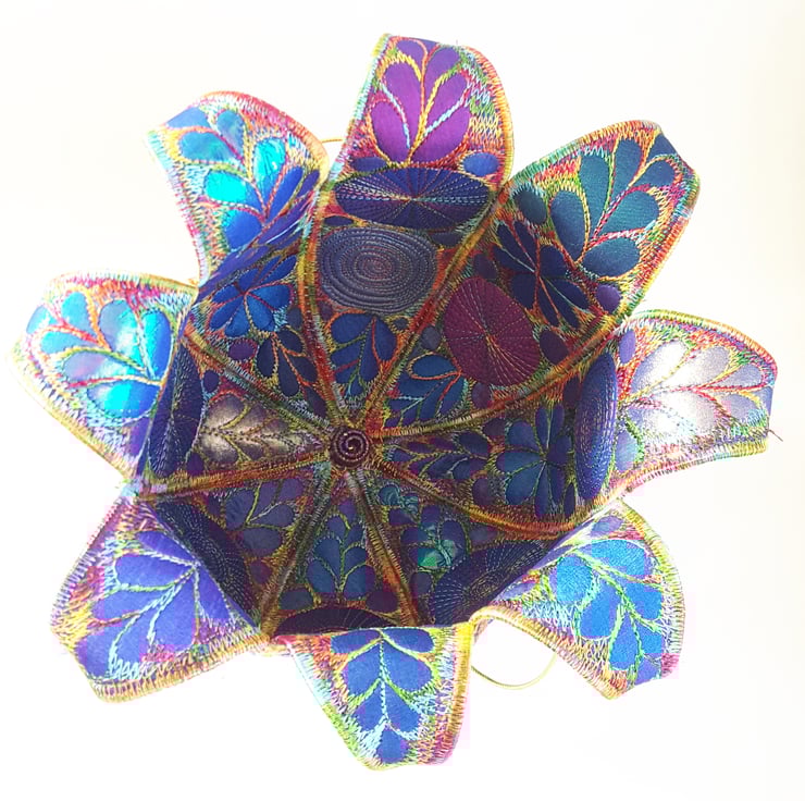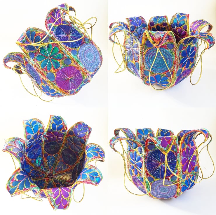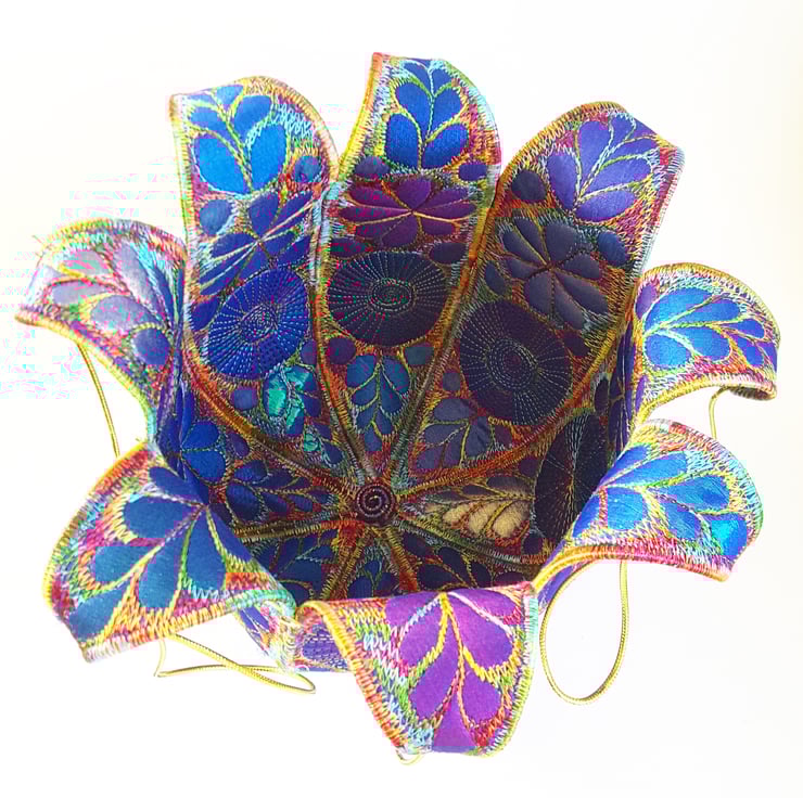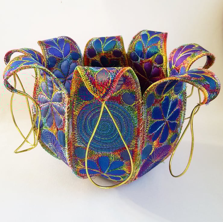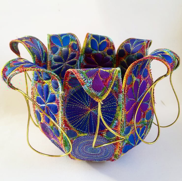 This is a sturdy handmade textile bowl in jewel like colours