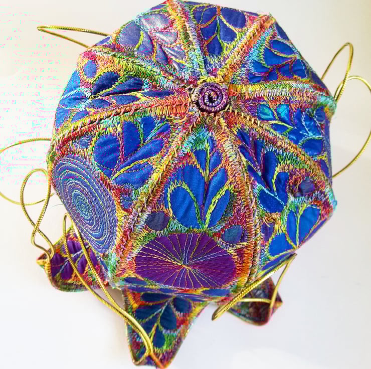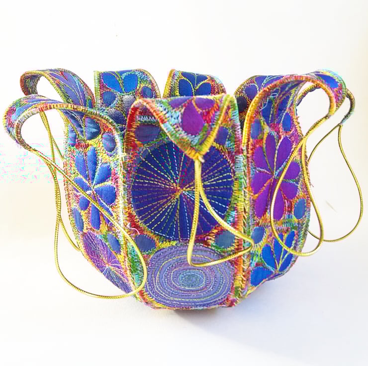 Made from layers of fabric including hand dyed Egyptian cotton and silk fabrics using the free machine embroidery style of sewing