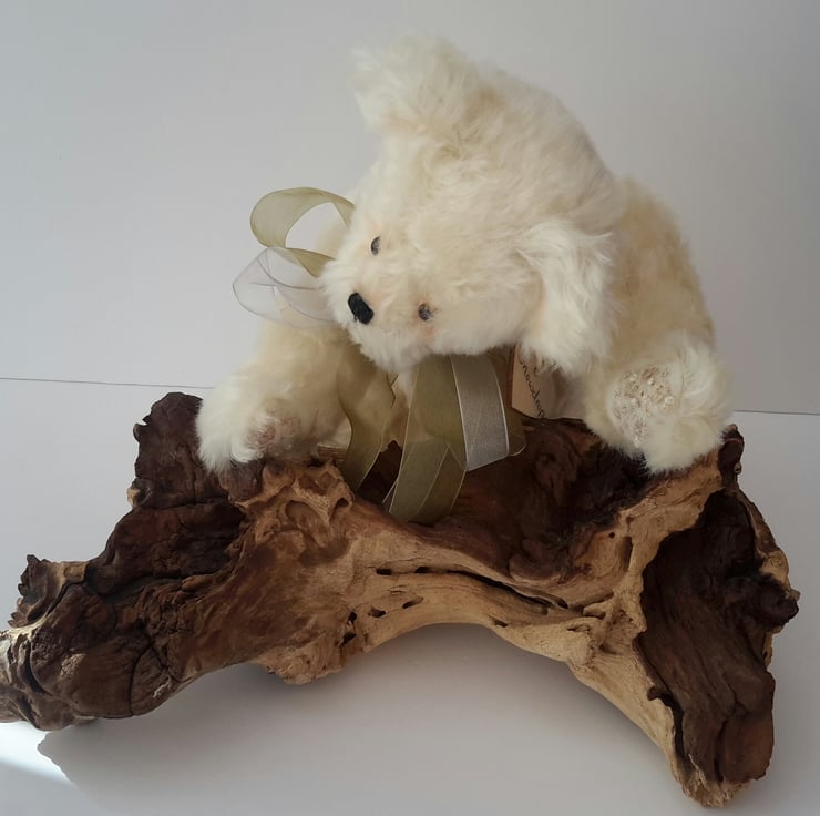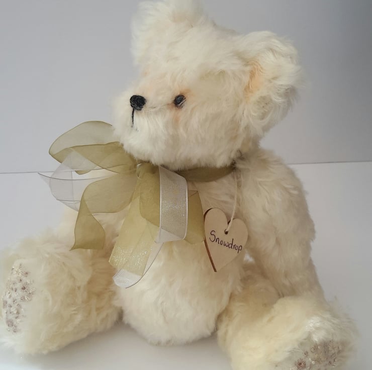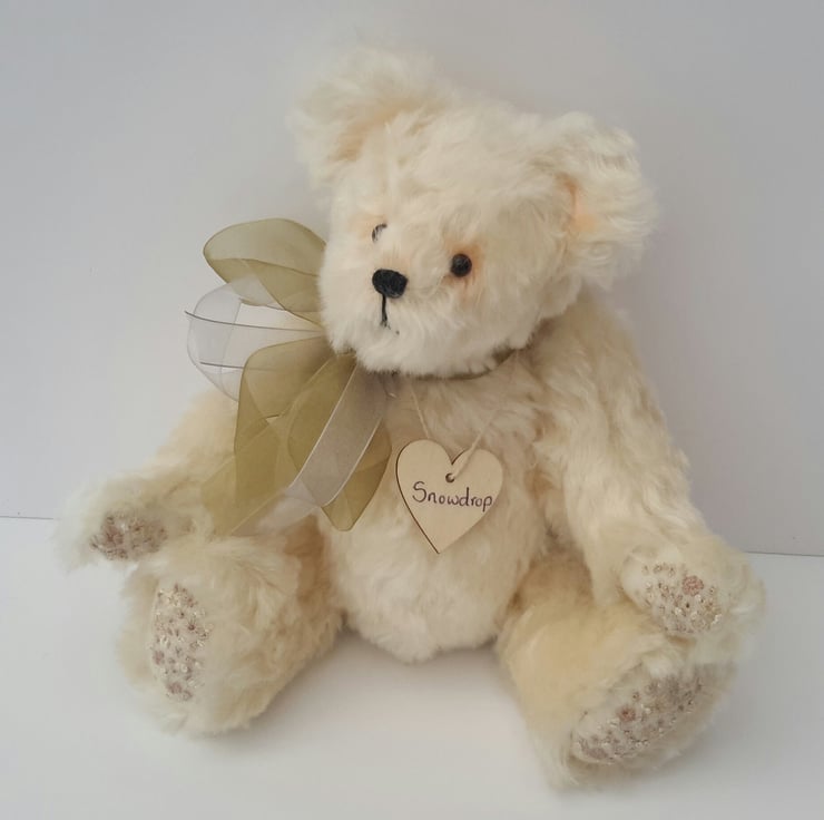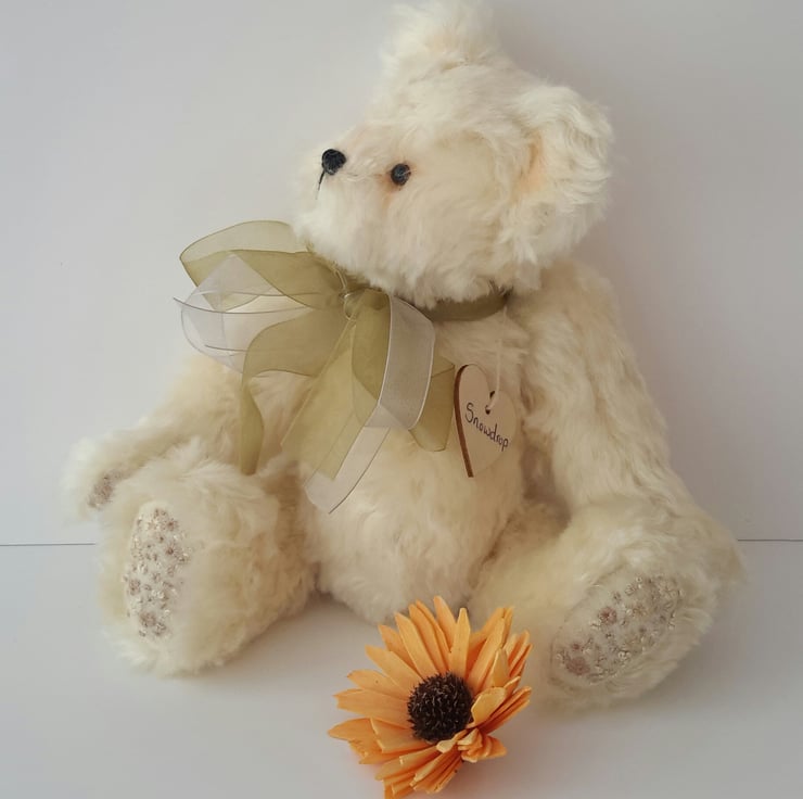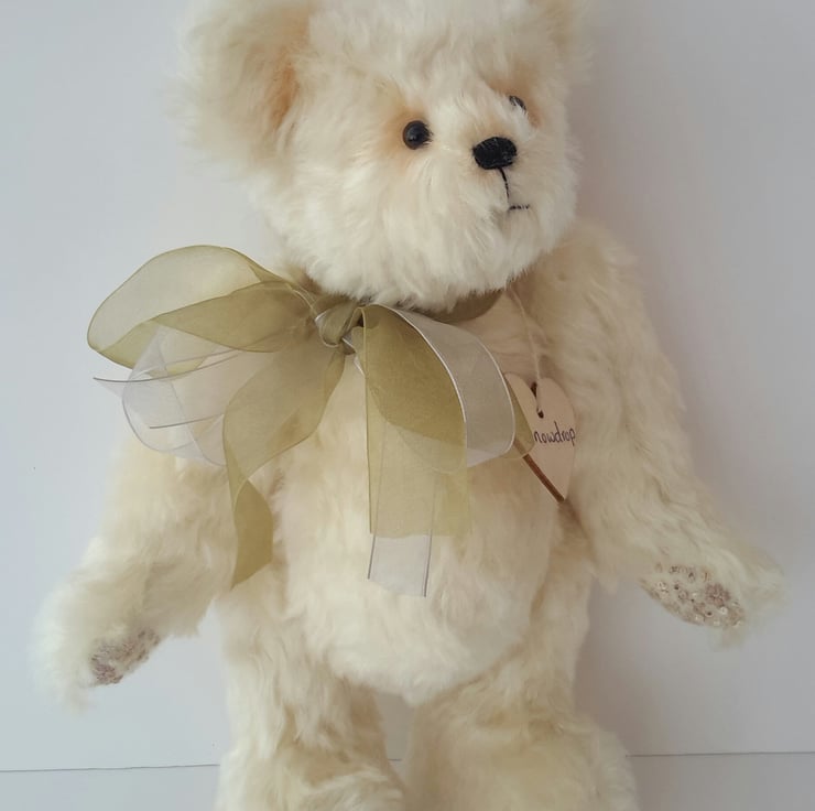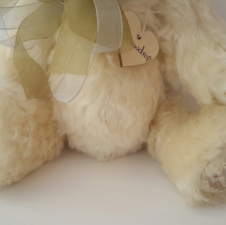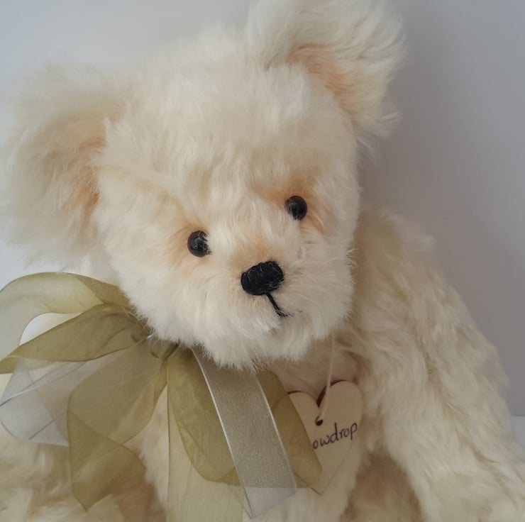 Meet Snowdrop, a luxury, collectable mohair bear, One of a kind artist bear, designed and created by Bearlescent in beautiful Steiff Schulte mohair.