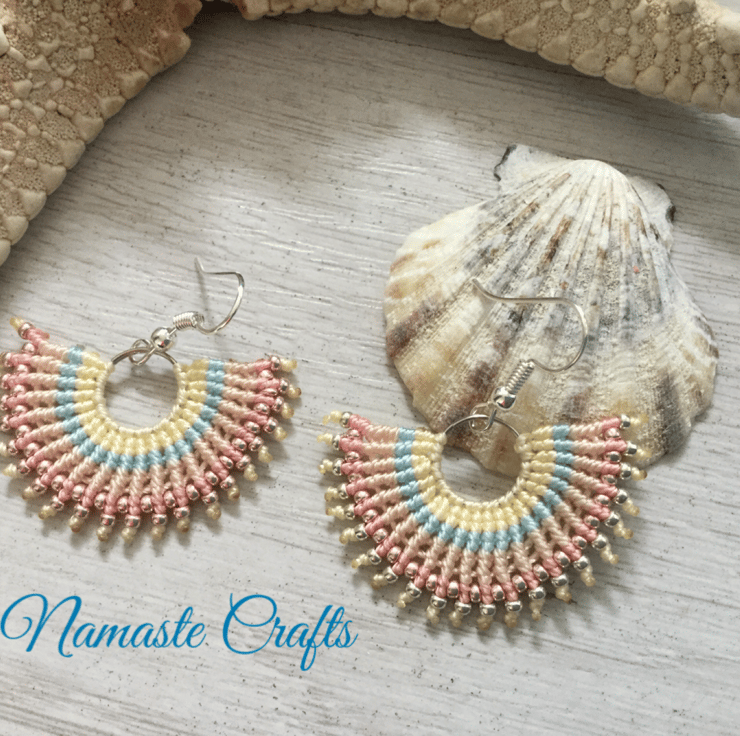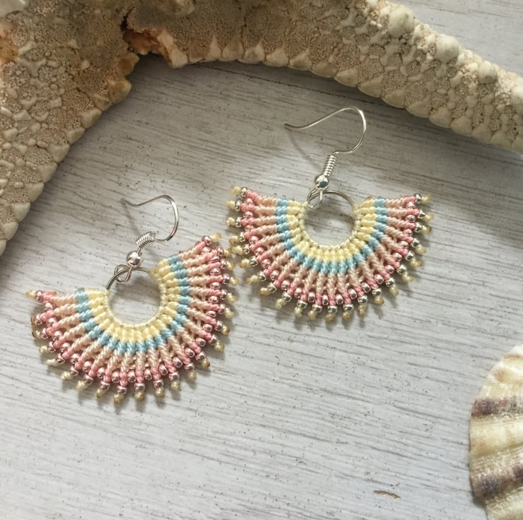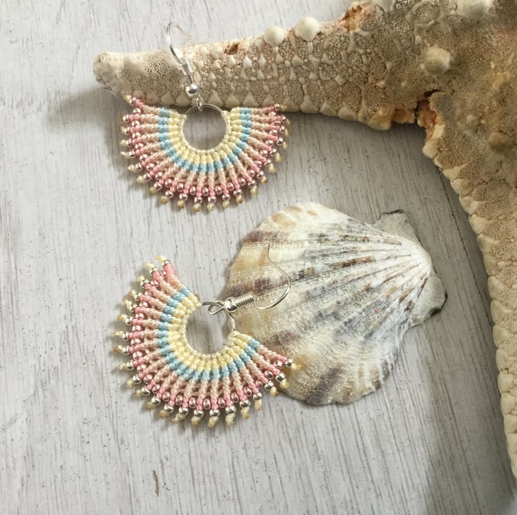 I have created these earrings using the delicate art of macrame using very strong C Lon thread in shades of lemon, peach and pale blue. giving a fan effect and finishing the design using delicate Miyuki glass seed beads in rose gold for a little bit of sparkle.