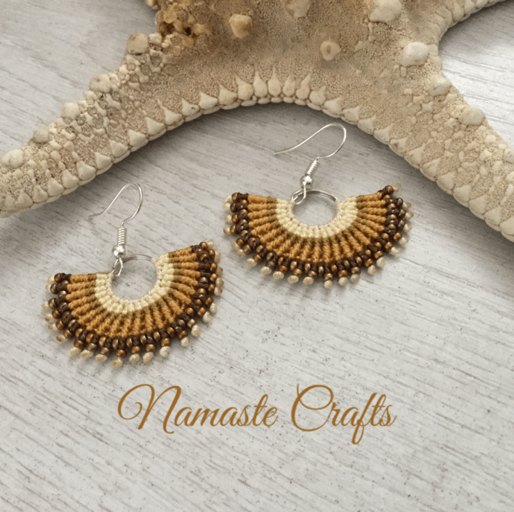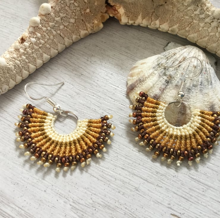 I have created these earrings using the delicate art of macrame using very strong C Lon thread in shades of natural gold and brown giving a fan effect and finishing the design using delicate Miyuki glass seed beads in copper for a little bit of sparkle.