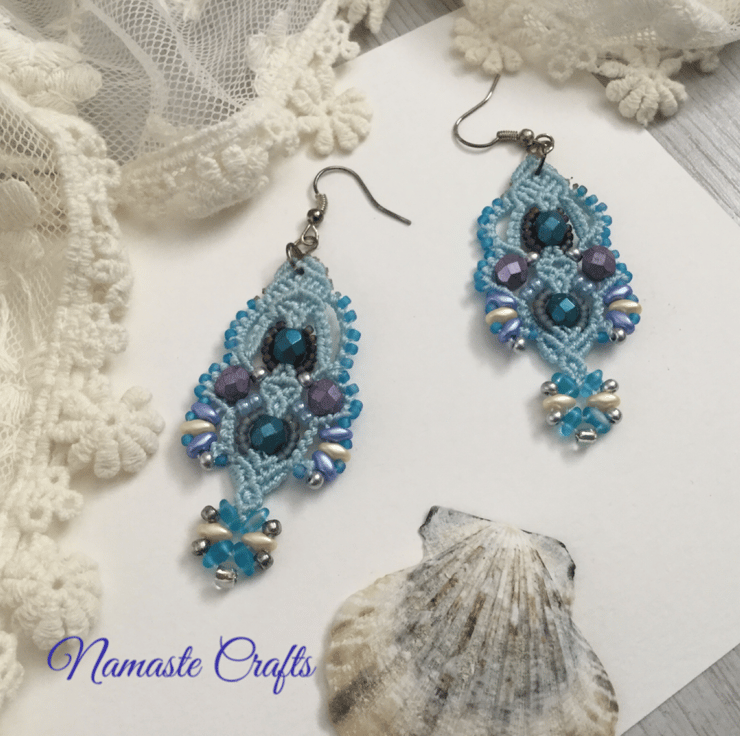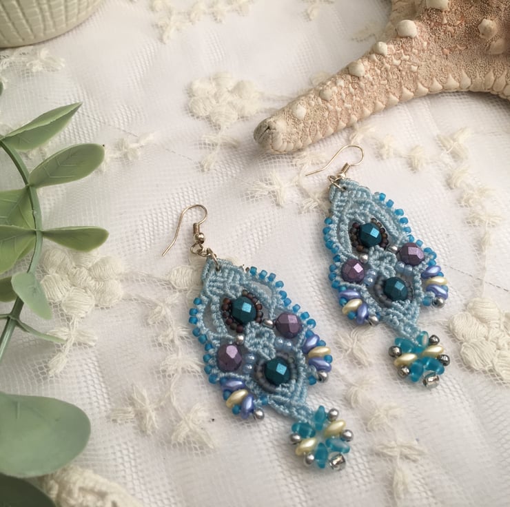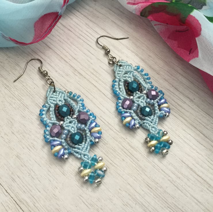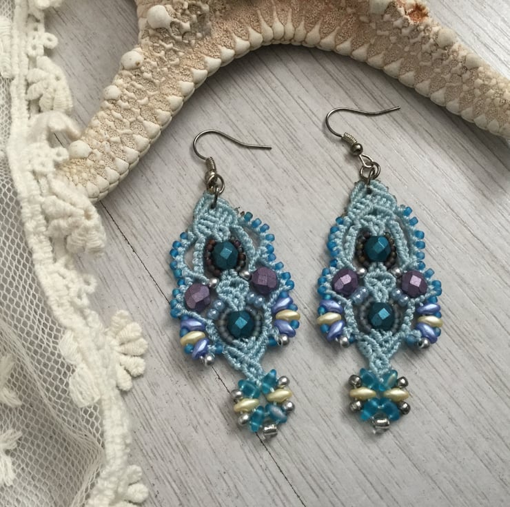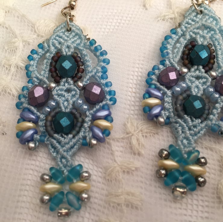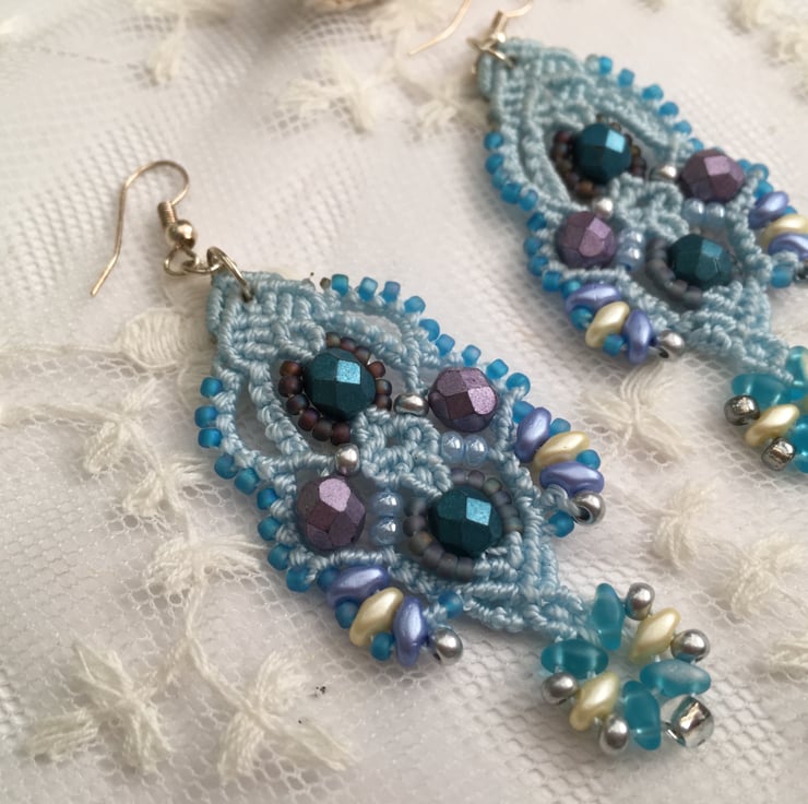 These pretty earrings are created using the delicate art of macrame. I have used strong but light weight C Lon macrame thread and interlaced with a selection of glass beads, including fire polished, Mikuki Superduo and Toho seed beads.