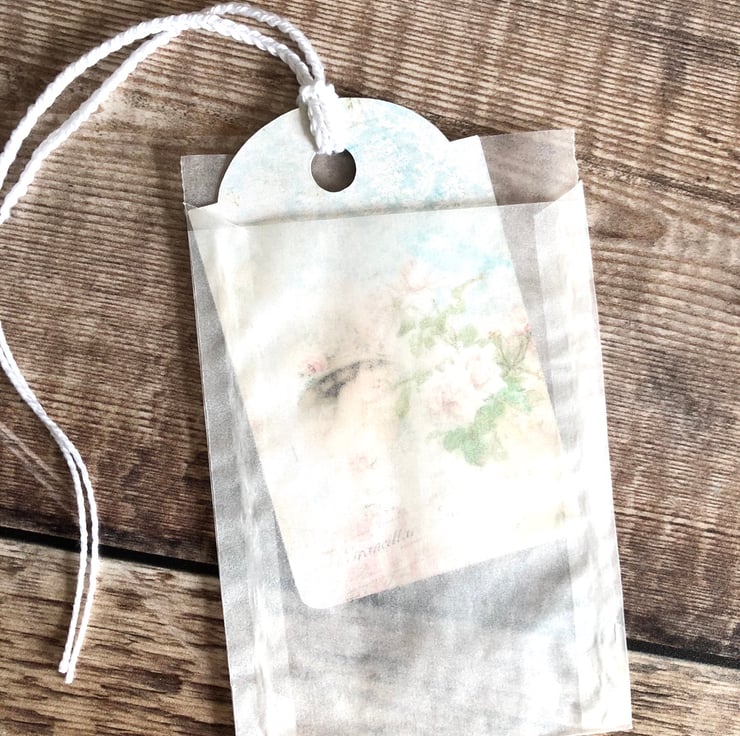 3 x handmade tags ... one has hand crocheted string and two have white bulb pins .. comes in glassine bags