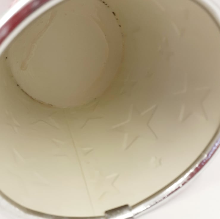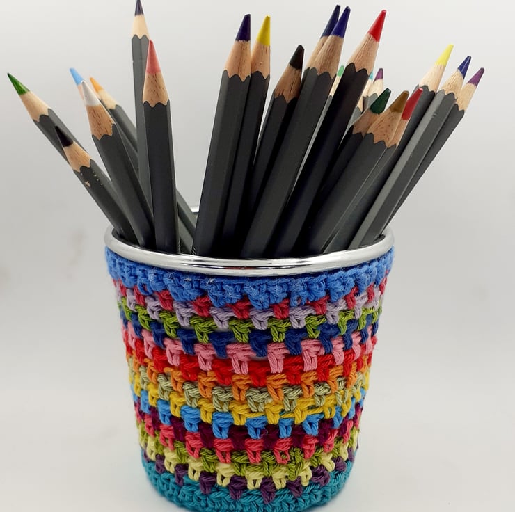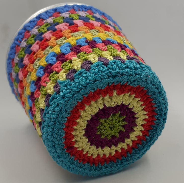 This cheerful pot is made from a repurposed metal plant cache pot. It has been covered in brightly colourful cotton crochet which is glued in place under the rim of the pot. Inside the metaI is painted a cream colour and has an embossed star pattern. It would be perfect for storing pens or other craft equipment and would be suitable as a container for a small pot plant. It measures approximately 9.5 cm in diameter at the top.