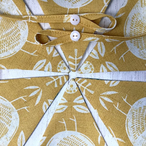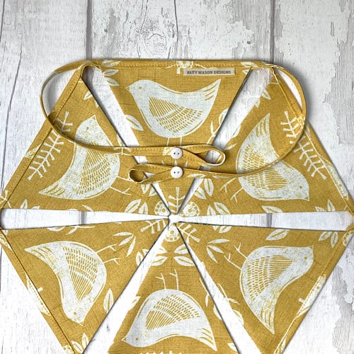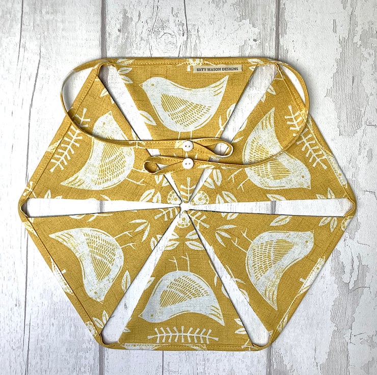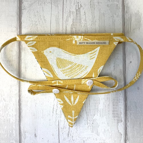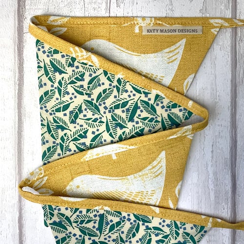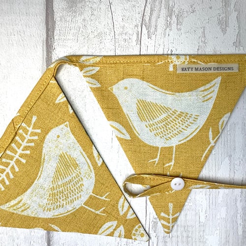Pretty yellow folk bird bunting. 7 double sided flags measuring 165cm with hanging loops and button detail. Backed in 30s style print cotton.