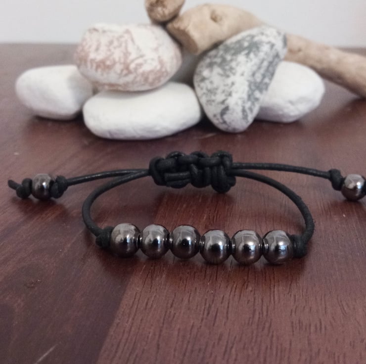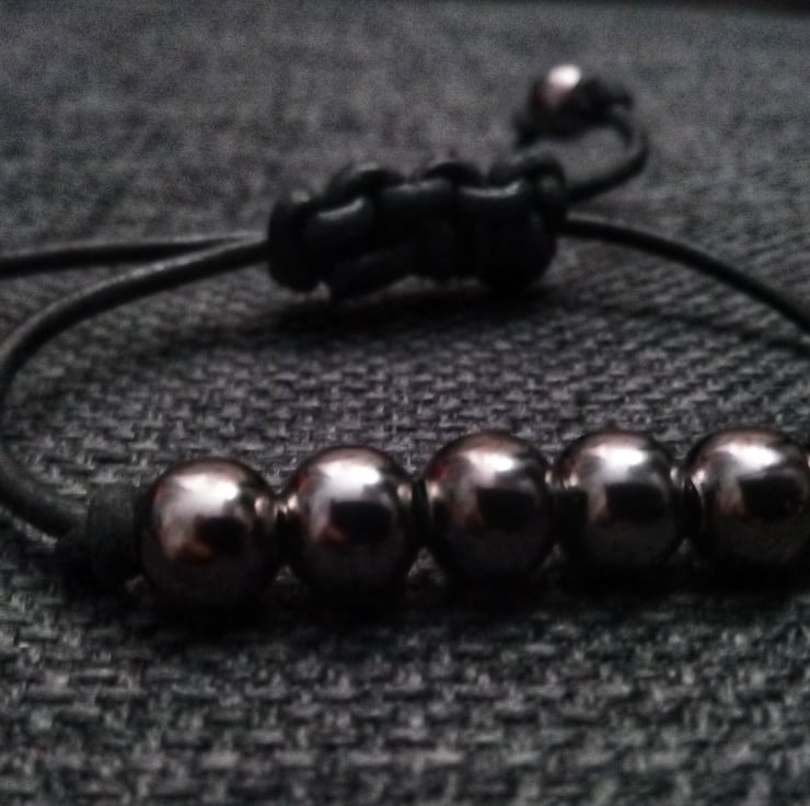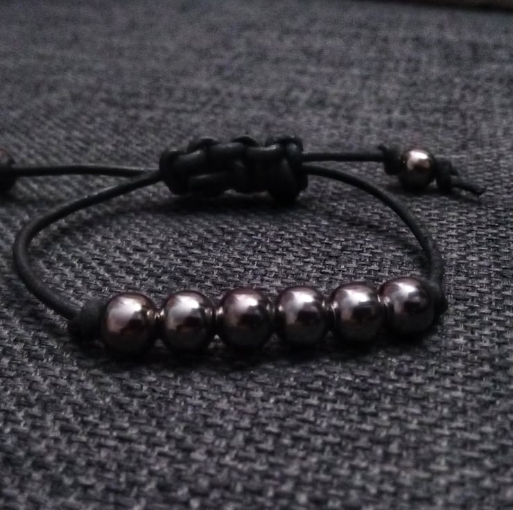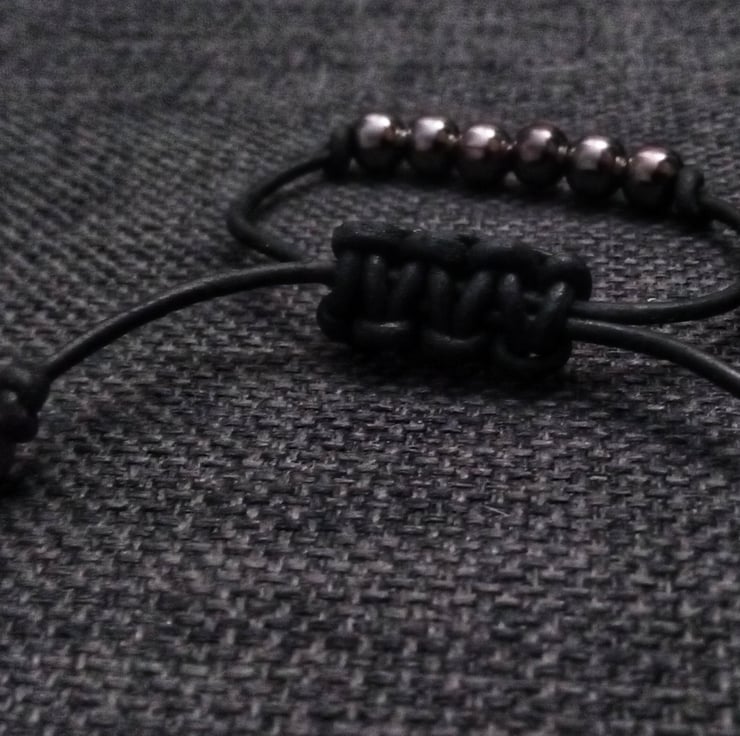 This cord bracelet has 6 shiny black beads as the main feature. The bracelet uses macrame knots to allow it to be adjustable. The ends of the cords each have another black bead.