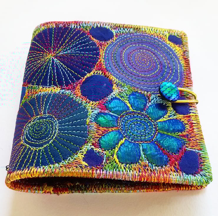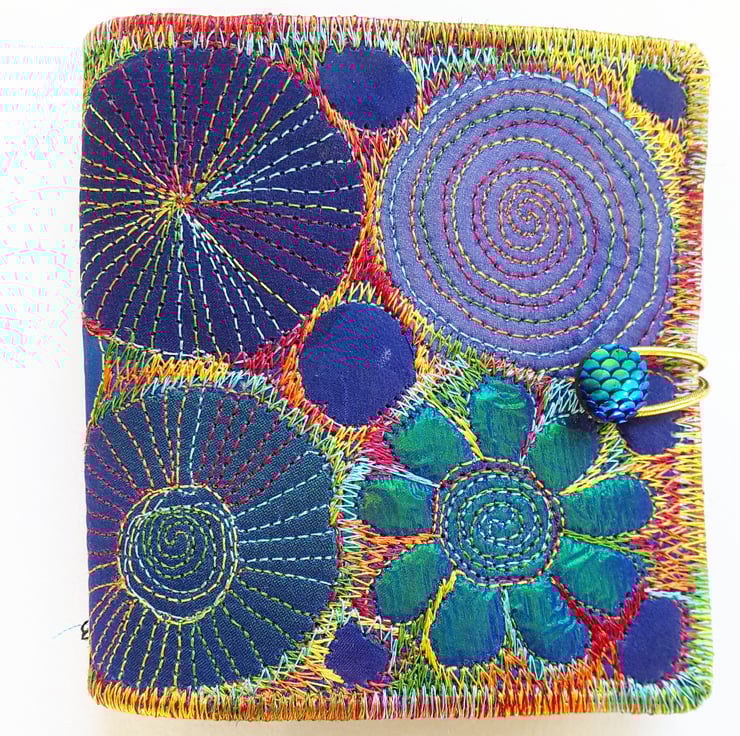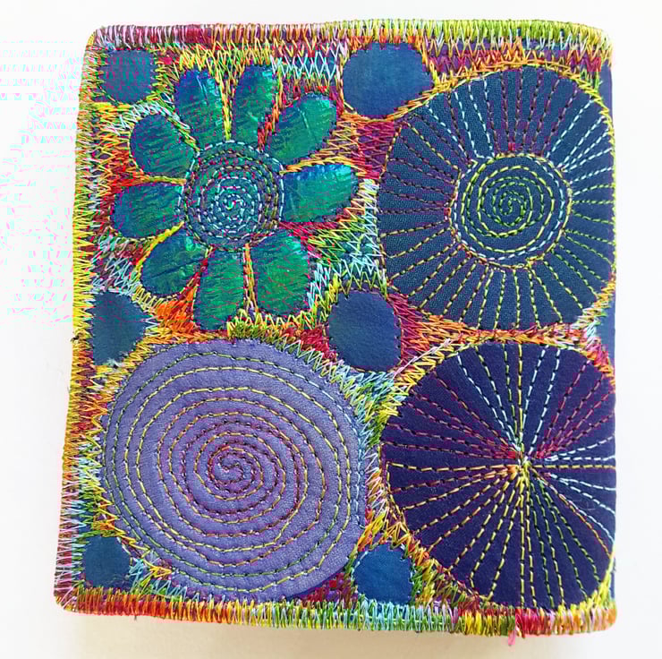Made from layers of fabric including hand dyed Egyptian cotton and silk fabrics using the free machine embroidery style of sewing