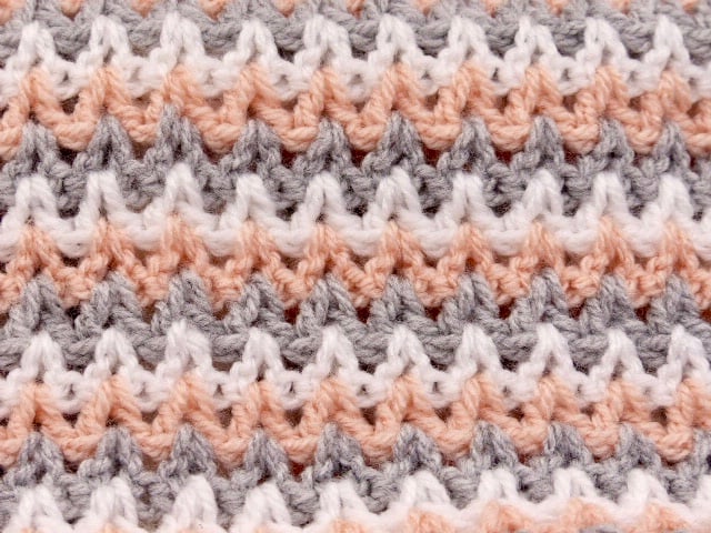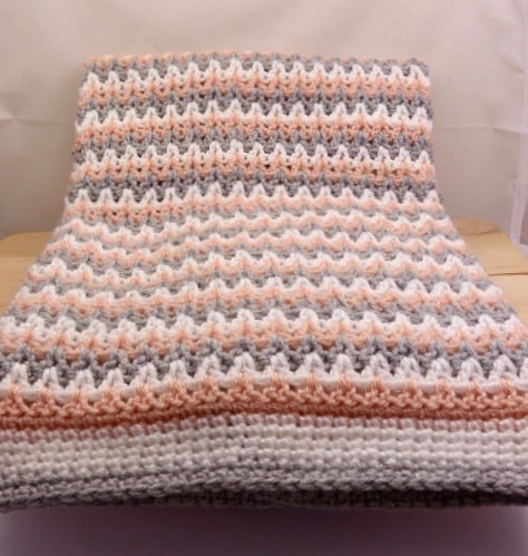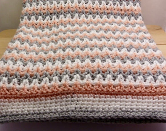 A crocheted blanket ideal for a pram, pushchair, car seat or moses basket. All yarns are quality 100% acrylic and the colours are grey, white and soft peach. Using the classic 'V' stitch It measures approximately 28" x 23" including a wide border. A lovely gift for any new baby or as a Baby Shower gift.