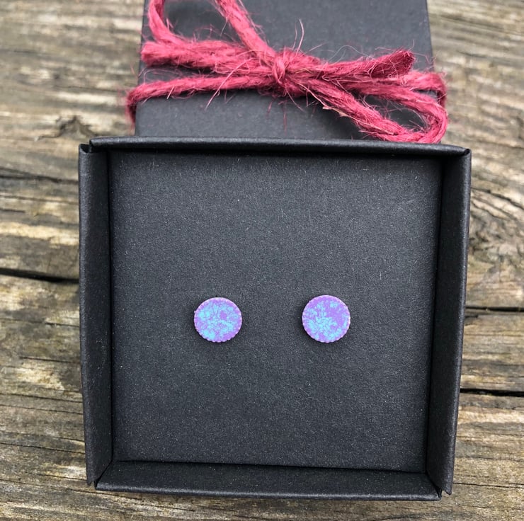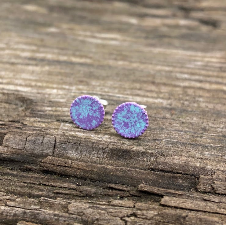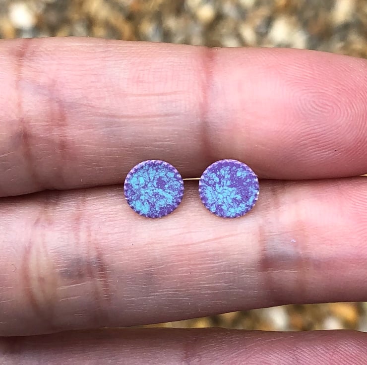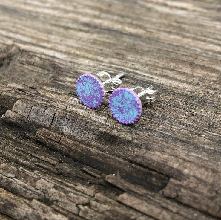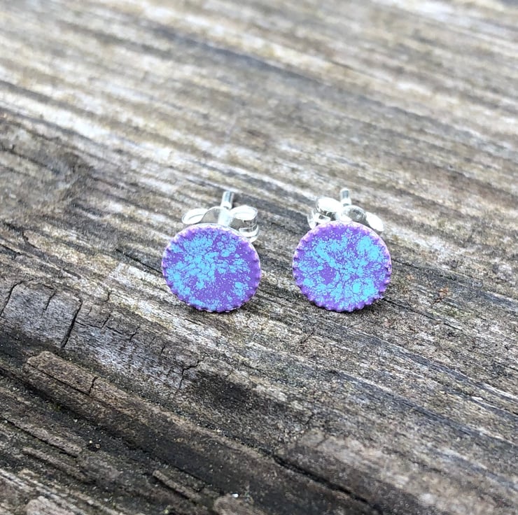 6mm milled edge sterling silver studs filled with layers of cold enamels until the desired look has been achieved. Fixed with sterling silver scroll backs.