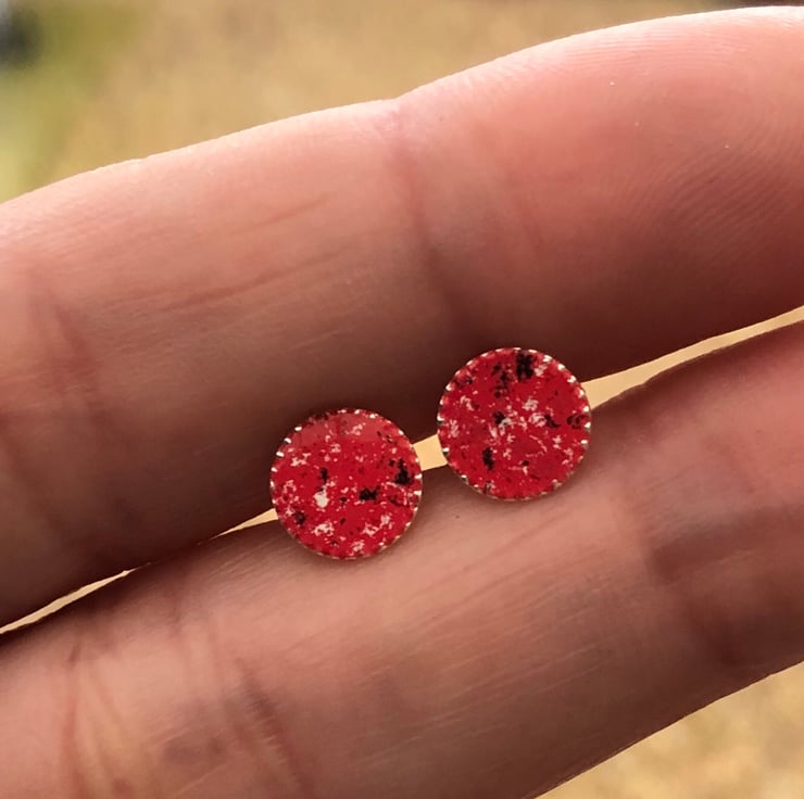 6mm milled edge sterling silver studs filled with layers of cold enamels until the desired look has been achieved. Fixed with sterling silver scroll backs.