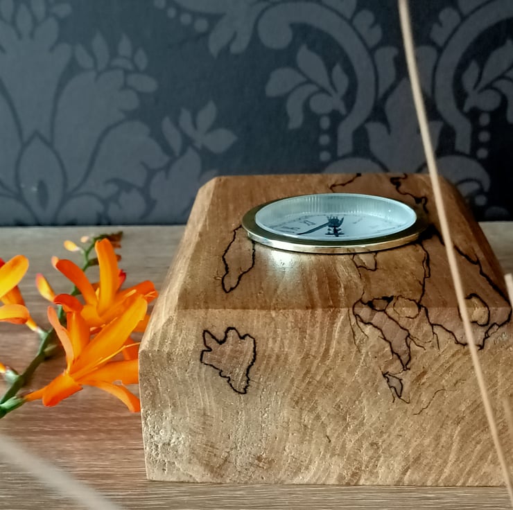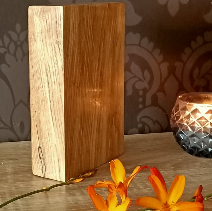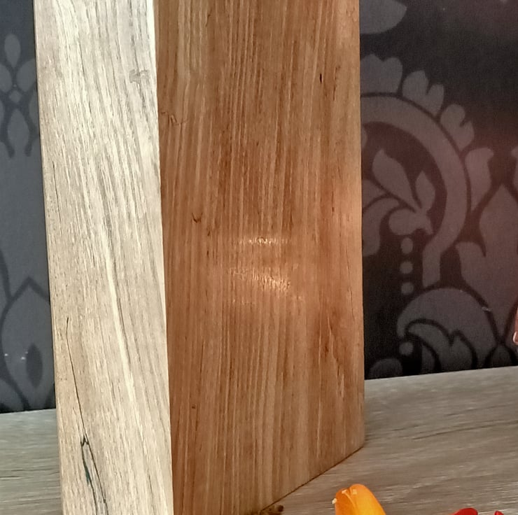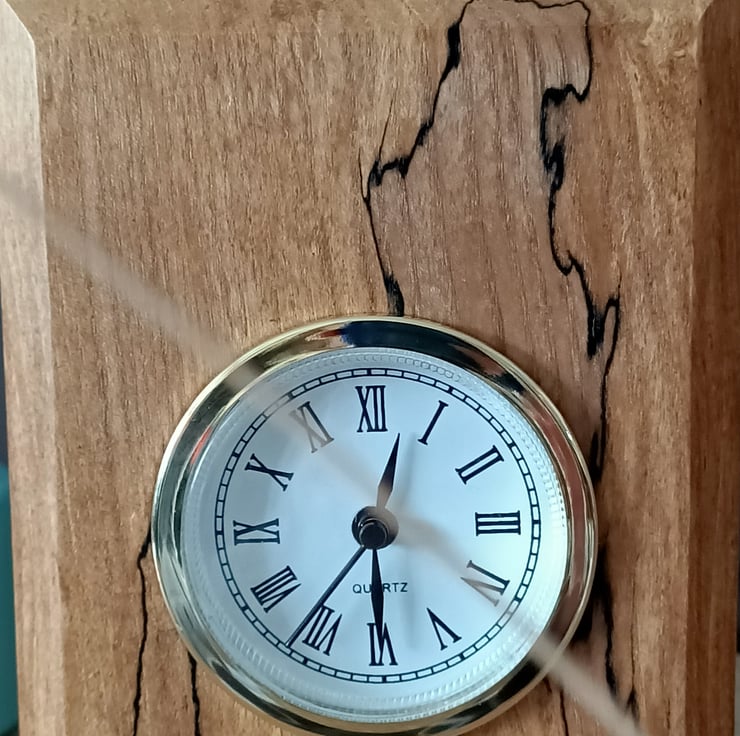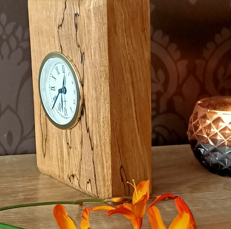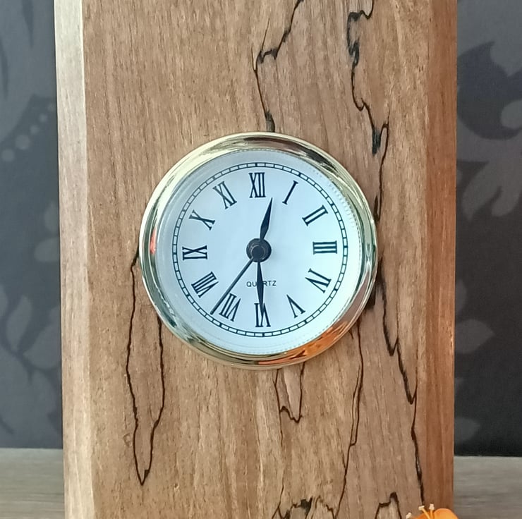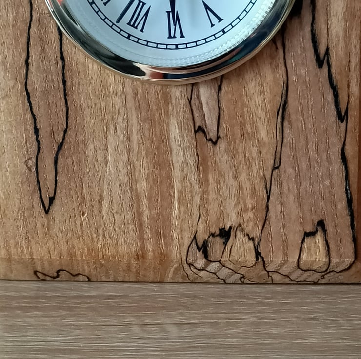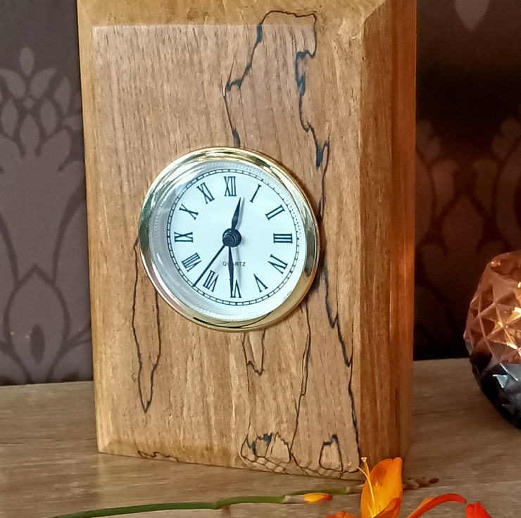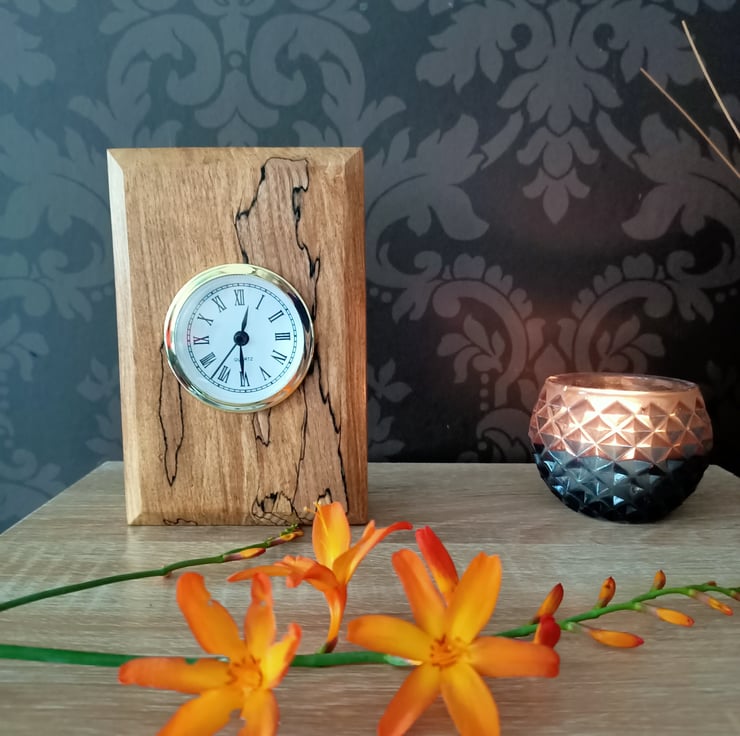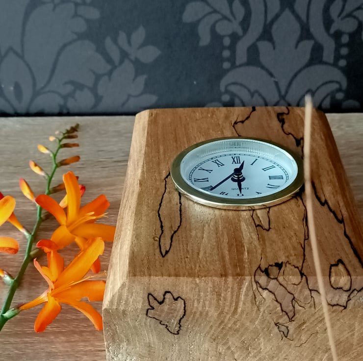 Wooden clock ash wood mantel bedside office clock. This beautiful clock has been made from solid Scottish ash wood with exceptional spalting and grain. The natural grain of this wood makes it very special, the wood is from a fallen ash tree over 200 years old. it has been beautifully hand crafted, cut shaped and sanded all by hand. It has a golden coloured plastic clock rim, approx 60 mm with white face and black roman numerals. the wood has been sanded and oiled .