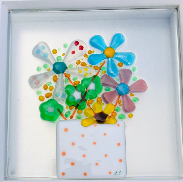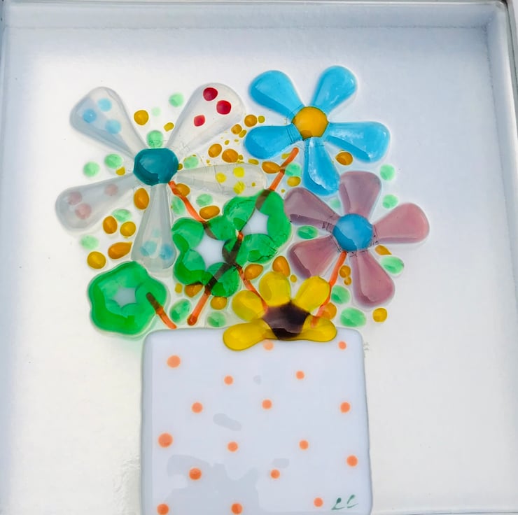 Rainbow coloured flowers in a spotted pot made entirely by me and fused in my kiln . All of the flowers are individually cut from sheet glass . Bright and beautiful this 20cm picture is mounted in a white wood frame . Easy to hang with metal hanger attached .
