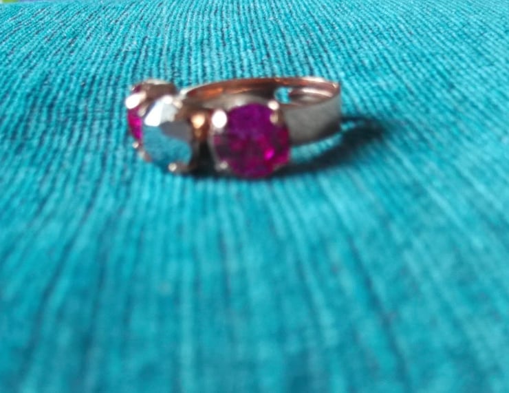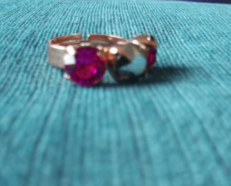 Made with fuchsia and light chrome chatons in a rose-gold ring base.