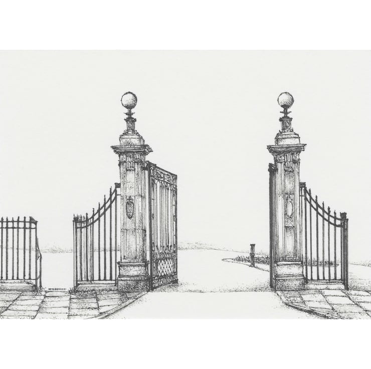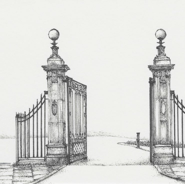 The stone and iron gates to the Sele in Hexham, Northumberland. A drawing I made of the view across the Hencotes road looking at the gated entrance, built there in 1908 to commemorate Lord Allendale's gift of the park lands to the public.