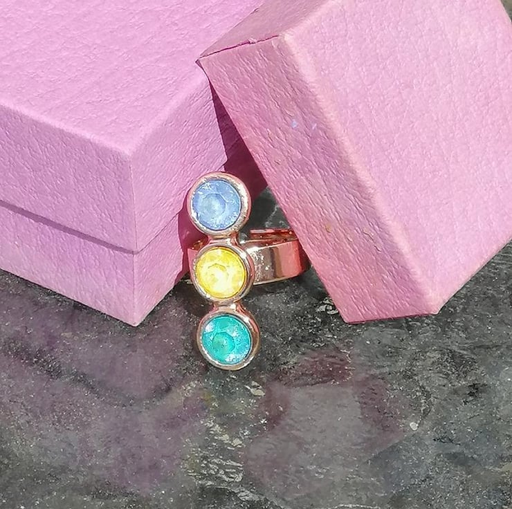Made with ss39 Ocean Delite, Sunshine Delite and Laguana Delite Swarovski chatons. Ring base colours may vary.