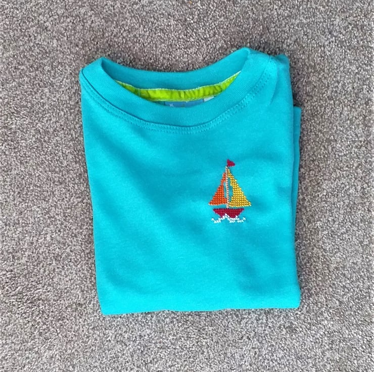 This is a gorgeous little turquoise T-shirt with long sleeves and a soft velvet band inside the back of the neck. I have hand-stitched a brightly coloured yacht on the left front. The boat itself is deep red, with yellow and orange sails and white waves breaking around it. The shirt is good quality pure cotton and can be machine washed.