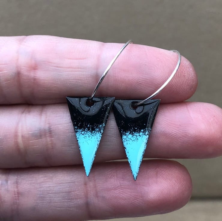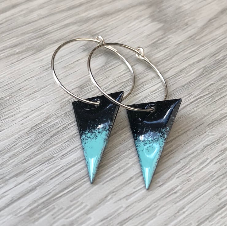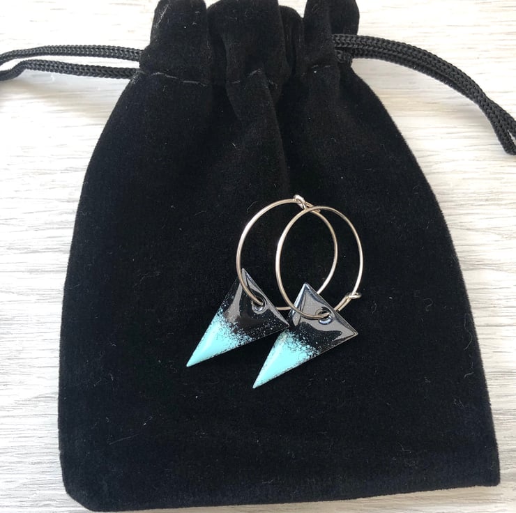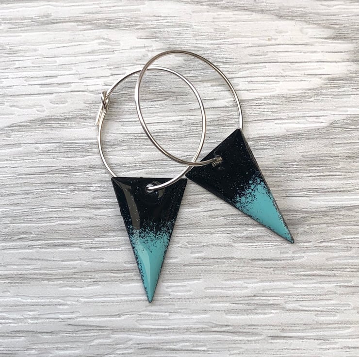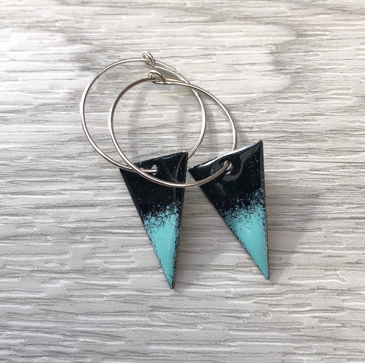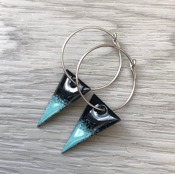 Black & Turquoise Enamel Triangle on Sterling Silver hoop earrings