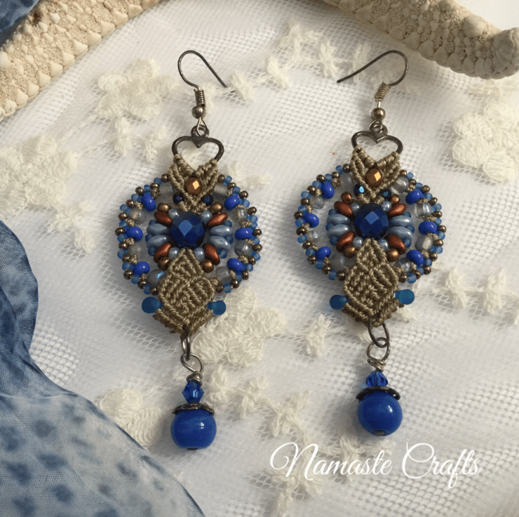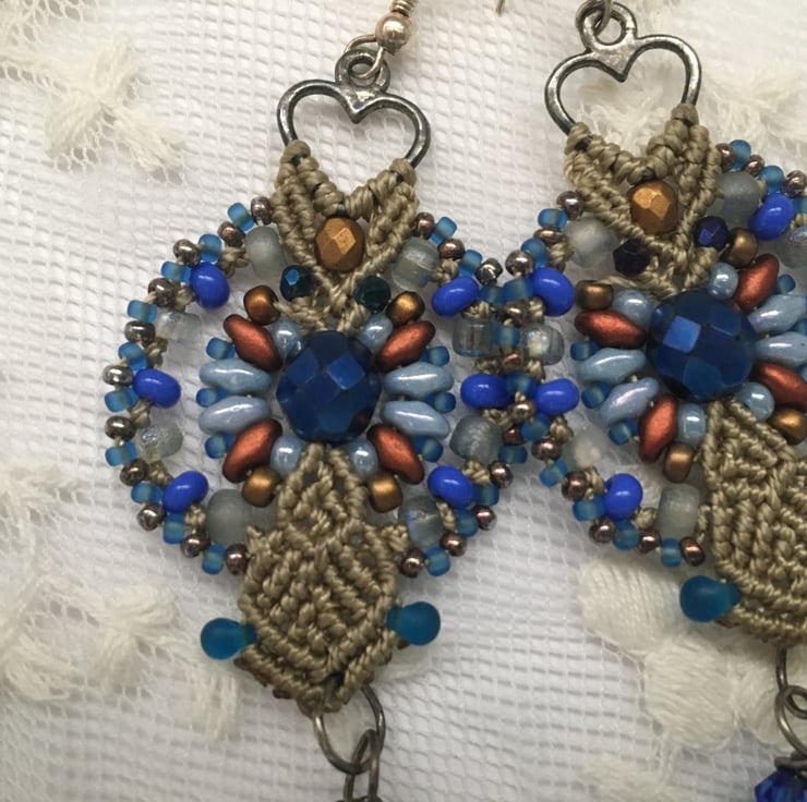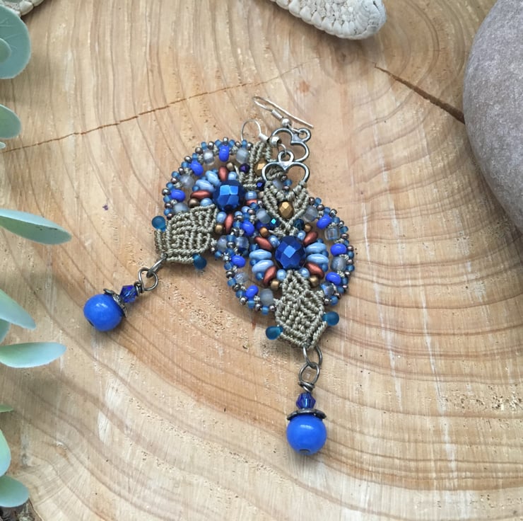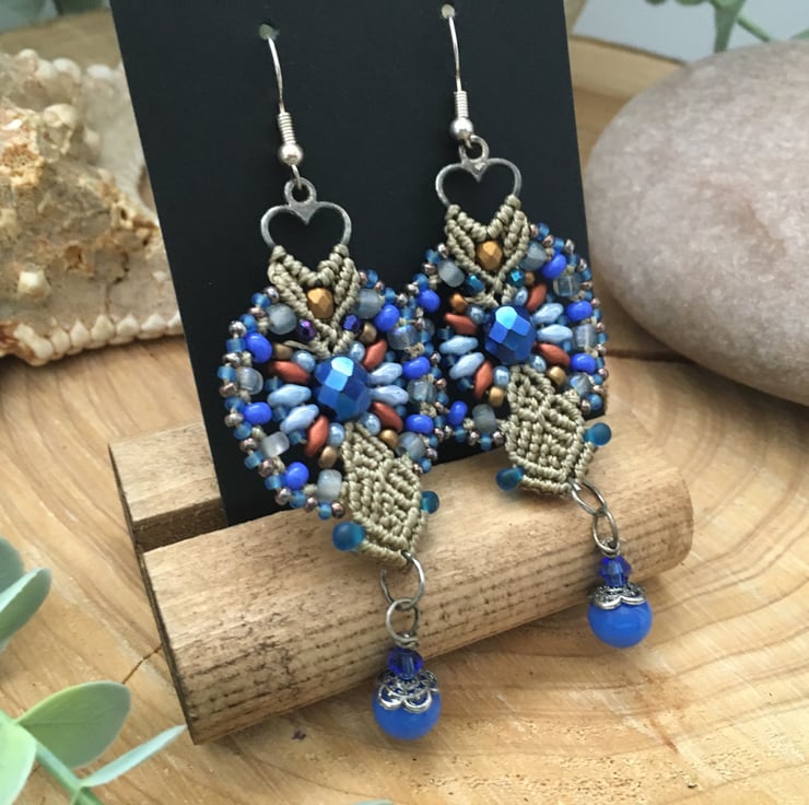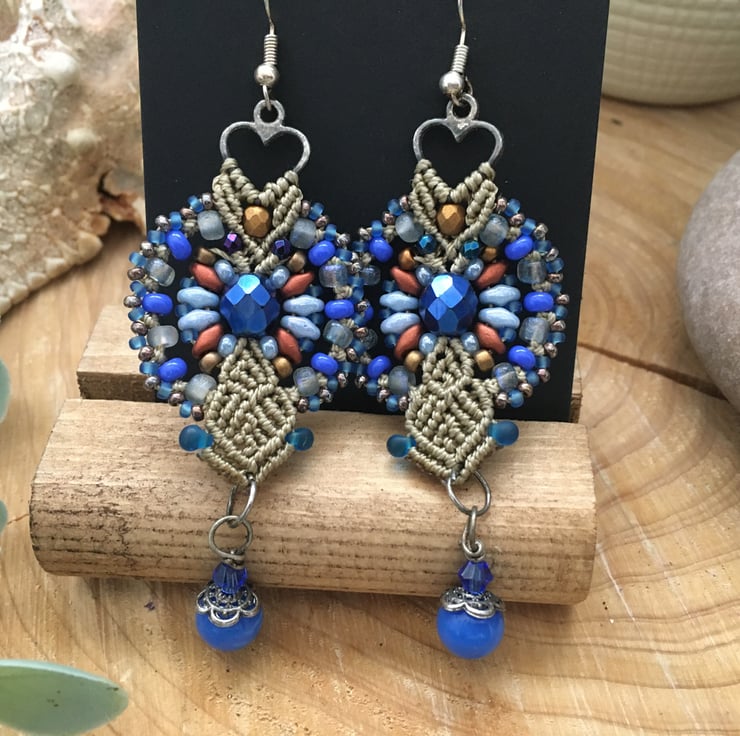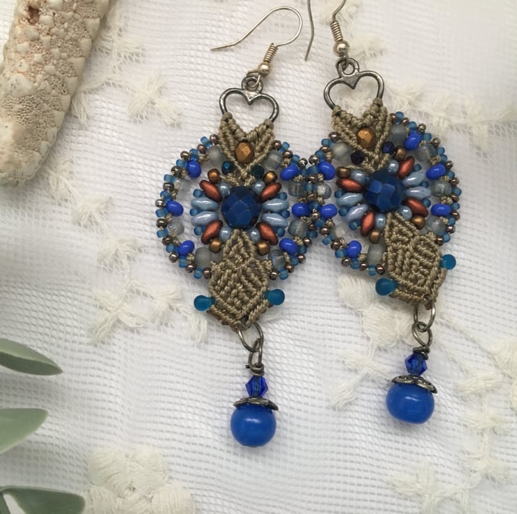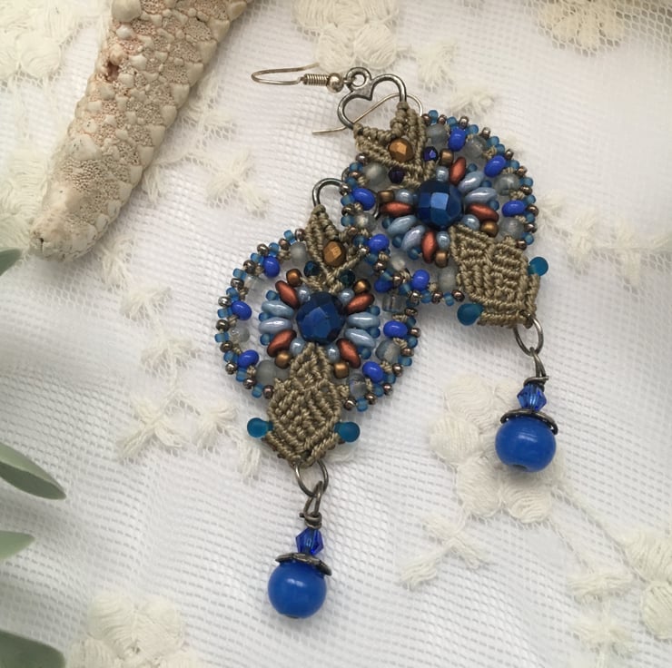 I have created these earrings using the delicate art of macrame using very fine C Lon thread in a natural colour. All the beads are glass and of the highest quality sourced from around the world. The beauty with macrame earrings is that they are so light you hardly notice you are wearing them so you get the wow factor without the weight.