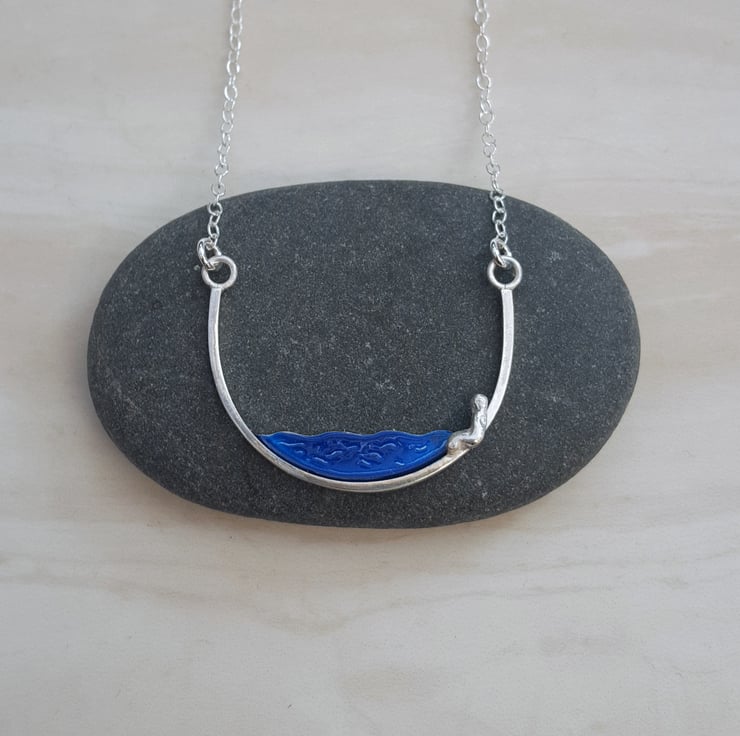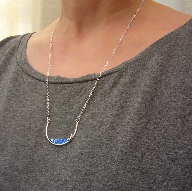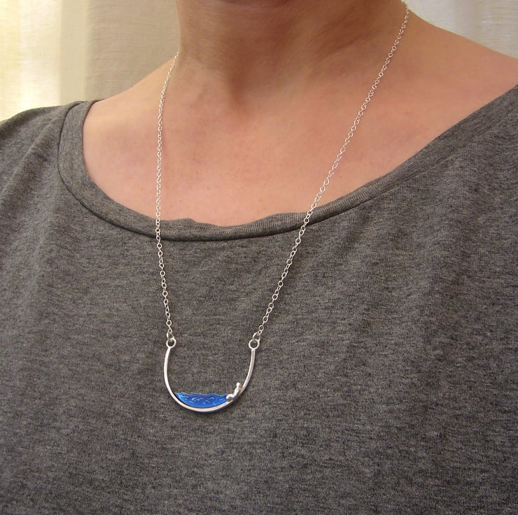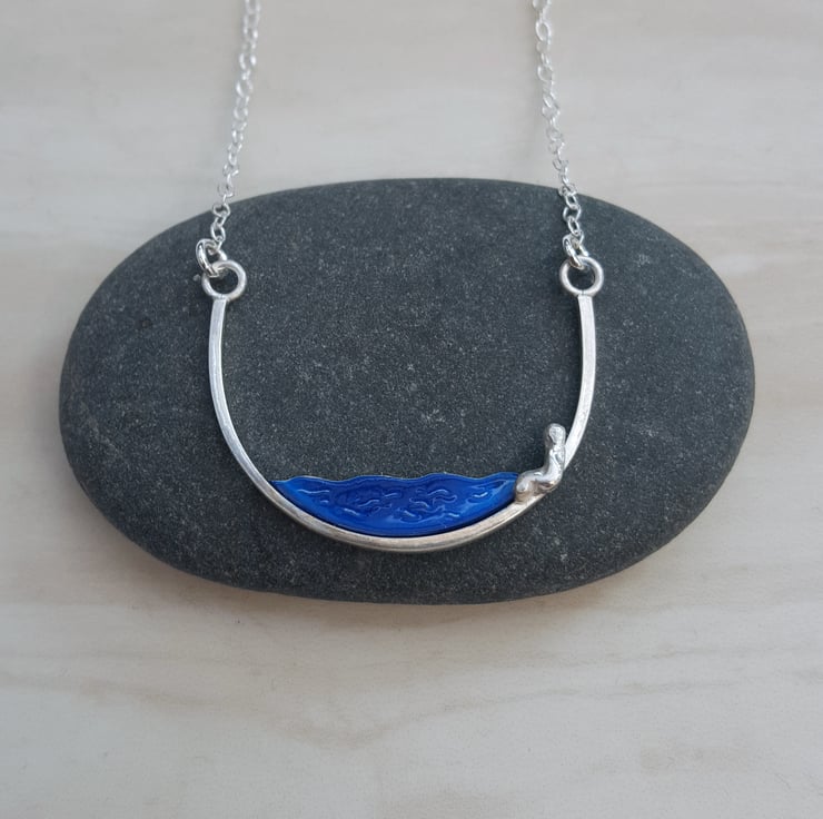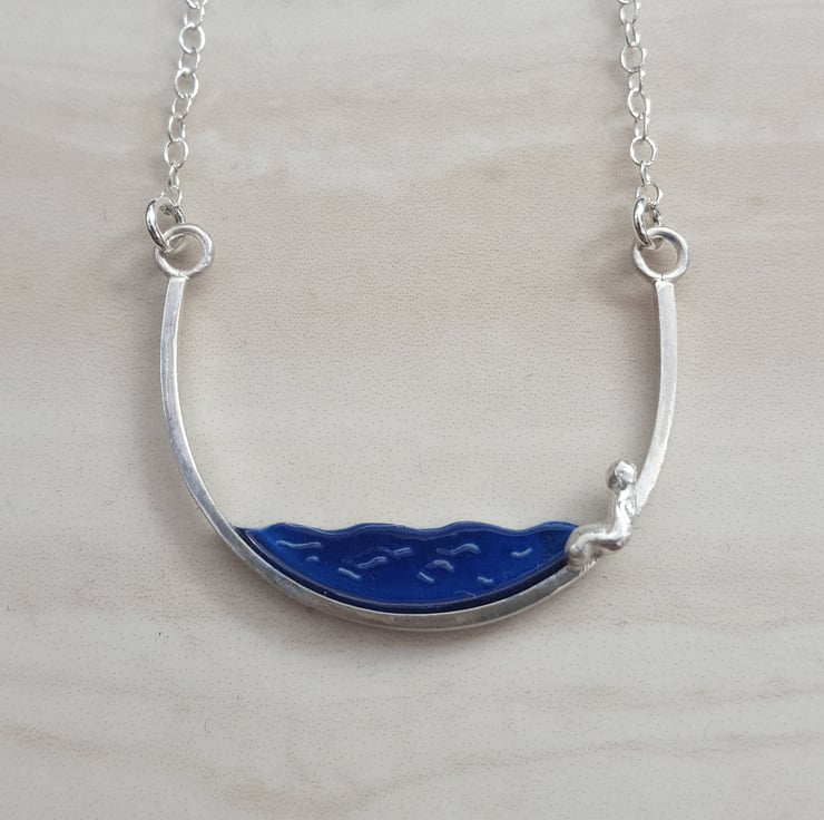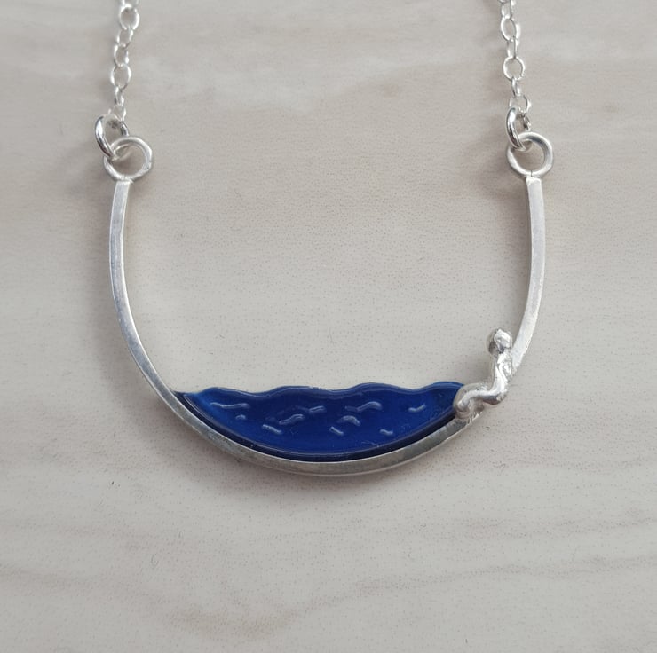 The necklace has been made by shaping square sterling silver wire and soldering sterling silver to the back. A tiny person made from silver clay has been soldered onto the wire, then the flat silver has been painted with enamel and given marks to represent waves. The piece is approximately 3.5cm wide and 2.7cm high and is attached to a 50cm sterling silver chain.