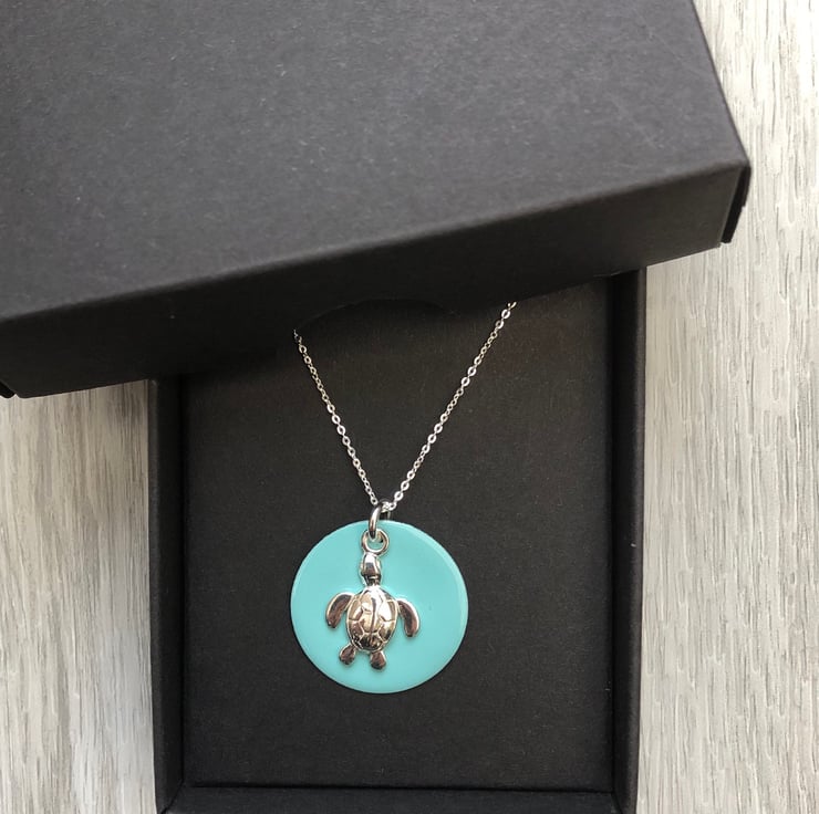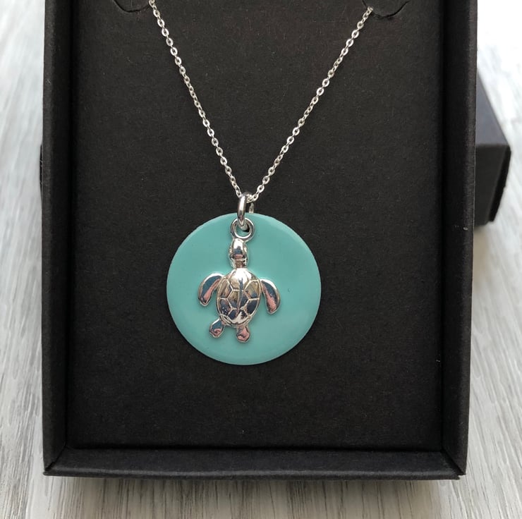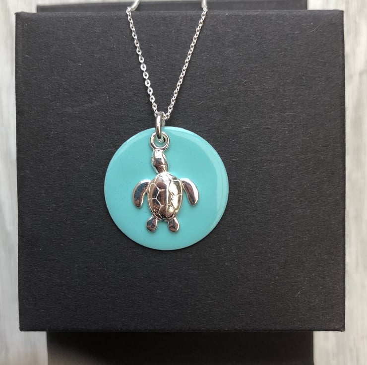 20mm metal charm has been hand enamelled in a light turquoise colour using the cold enamel technique.
