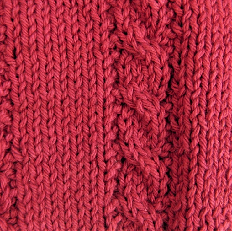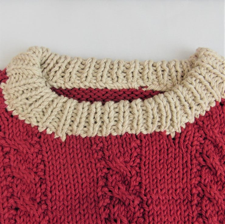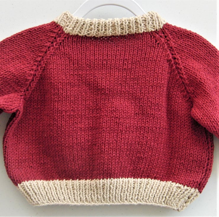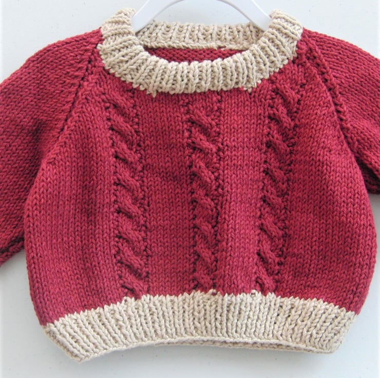 Warm and cosy baby sweater hand knitted in wine and jute coloured cotton yarn which makes a soft warm and cosy sweater. Jumper has a cable pattern on the front.
