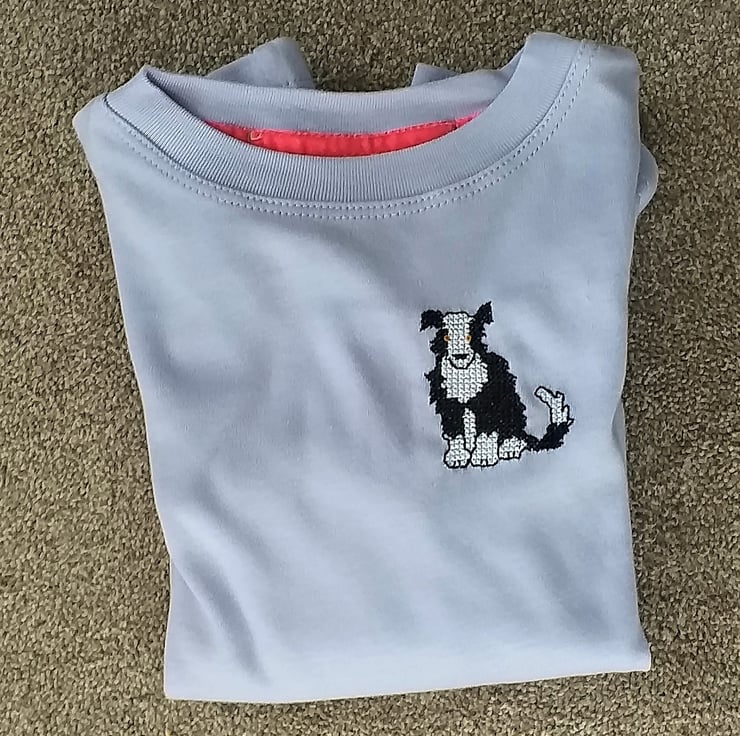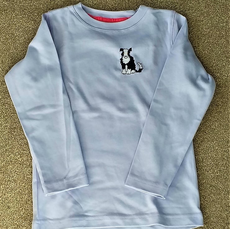 I have hand-stitched a black and white sheepdog on the front of this good quality, pale lilac, long-sleeved T-shirt. The shirt has a soft velvet band around the back of the collar. As I never use a permanent backing when embroidering kids' clothing, there is nothing inside the shirt to irritate your child's skin. It is 100% cotton and machine washable.