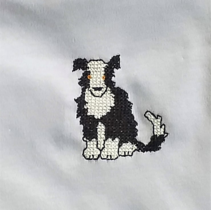 I first drew this lovely dog in order to stitch her on a shawl. She is based on my son's beautiful border collie, who frequently sits like this, staring at you, hoping you'll throw something for her.