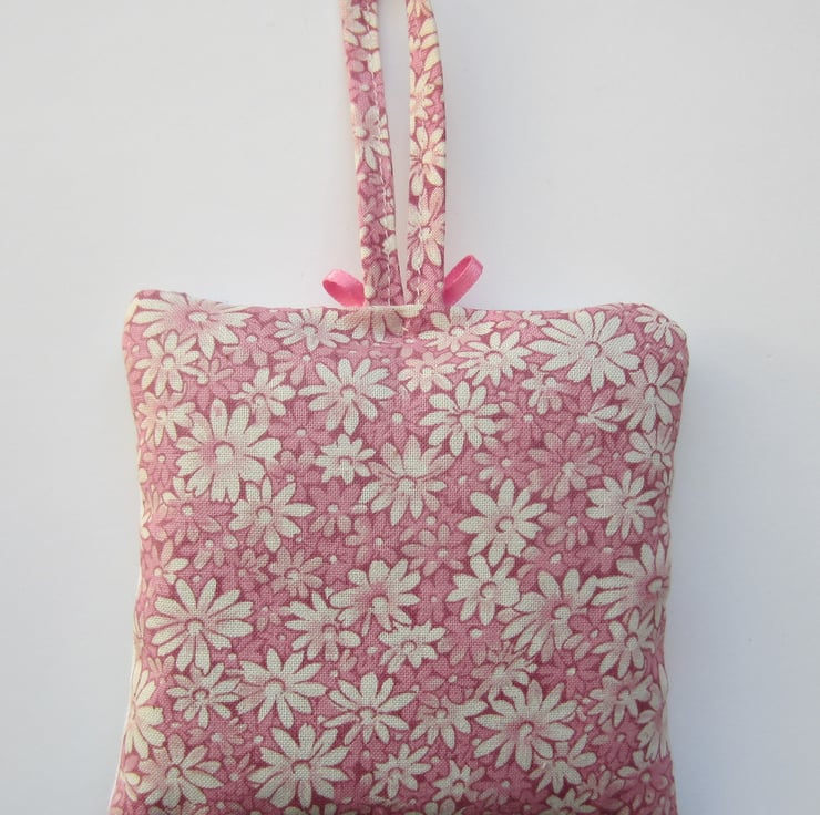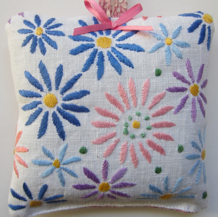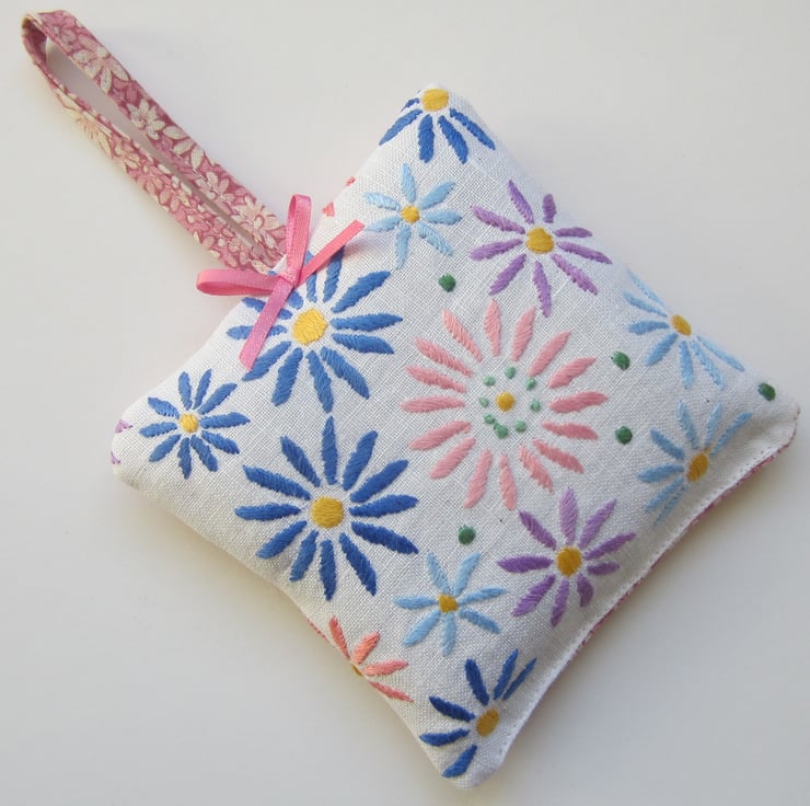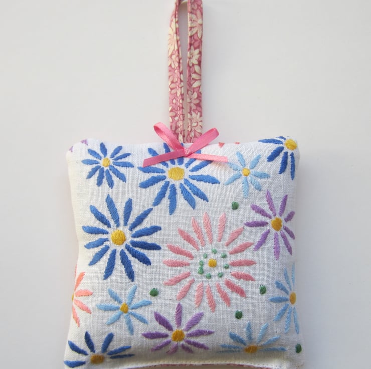 Hanging lavender sachet with a vintage embroidered front in a pretty blue and pink flower design and added pink ribbon bow. The back and loop are in a coordinating pink floral fabric.