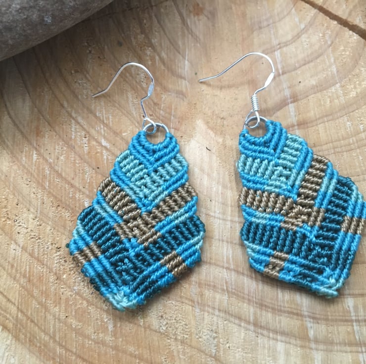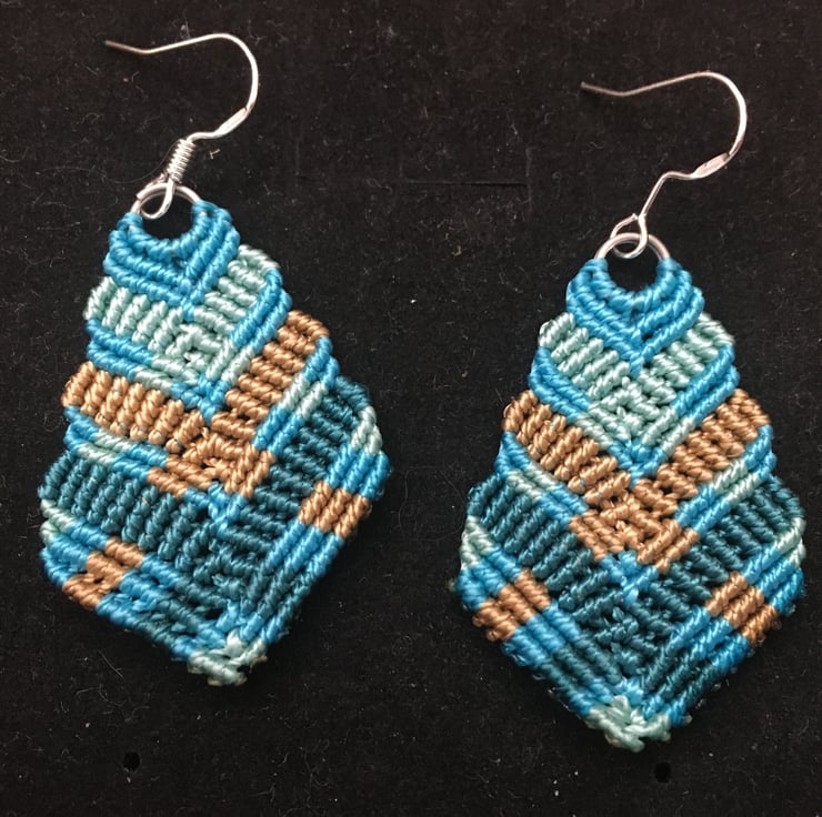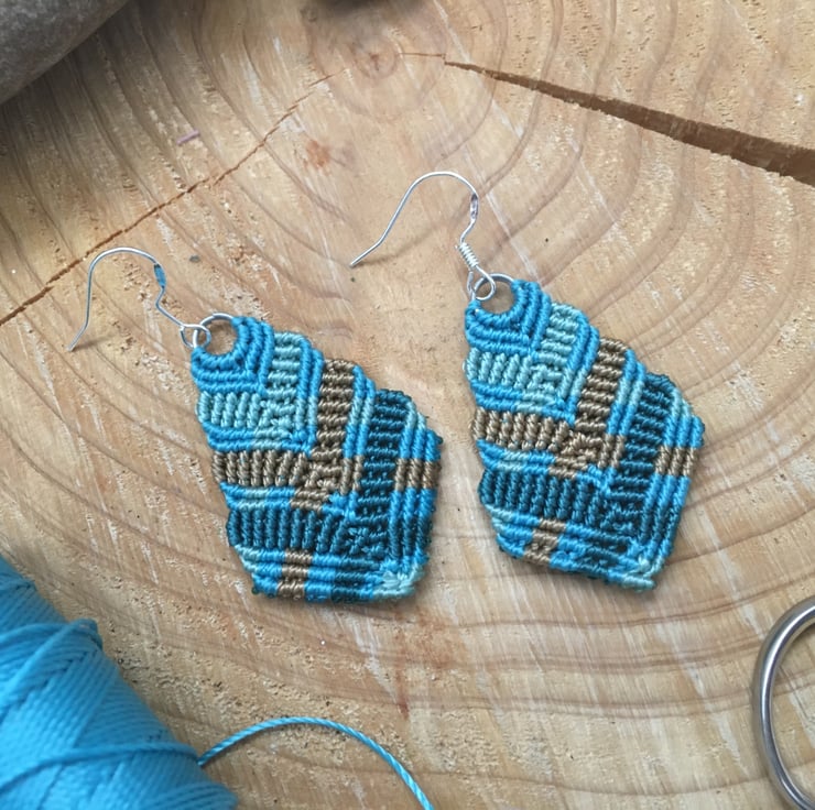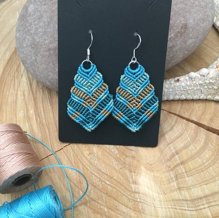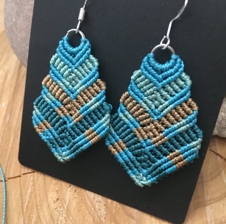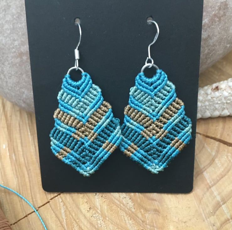 These pretty colourful earrings are created using the delicate art of macrame. I have used strong but light weight C Lon macrame thread in shades of turquoise and copper.