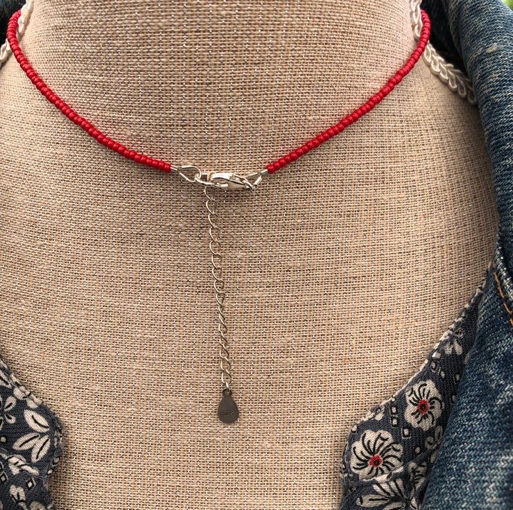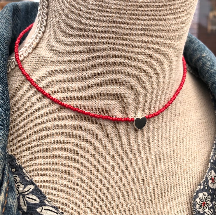 This light weight choker has been lovingly handmade using Czech glass seed beads and a sterling silver hollow heart.